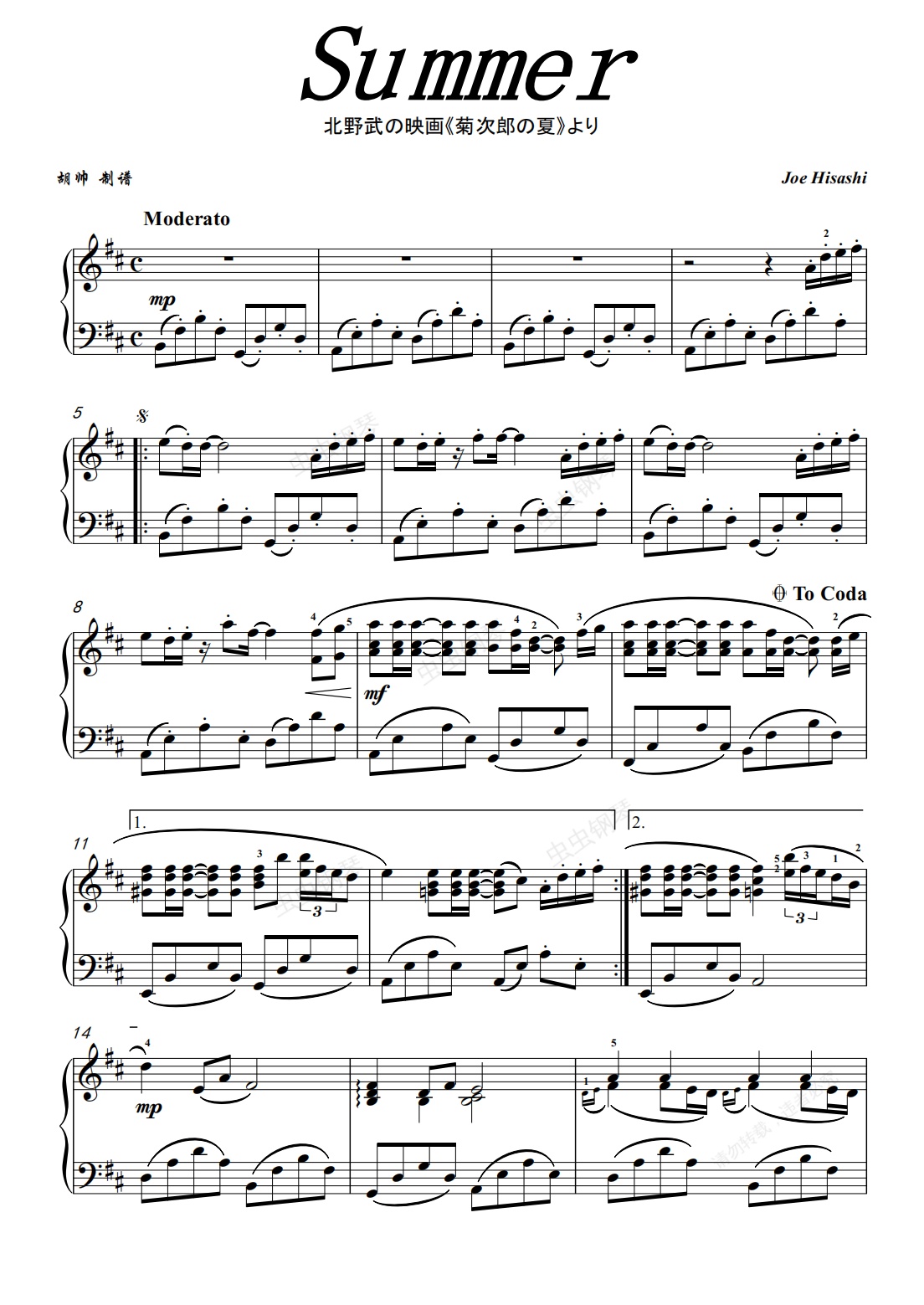 钢琴谱:Summer【菊次郎的夏天】