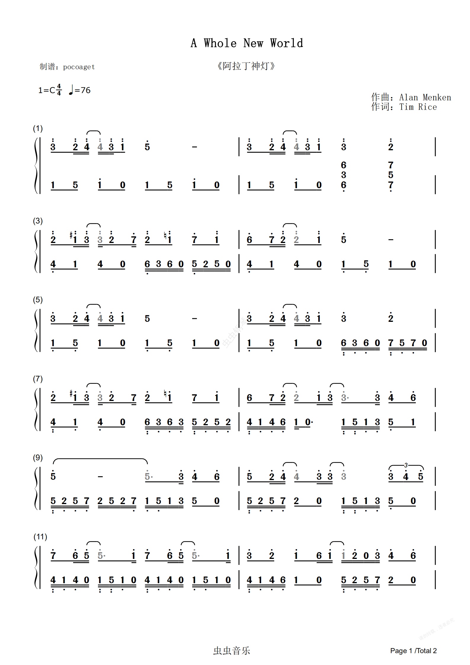 钢琴谱:《A Whole New World》简谱。阿拉丁神灯主题曲(poc编配)