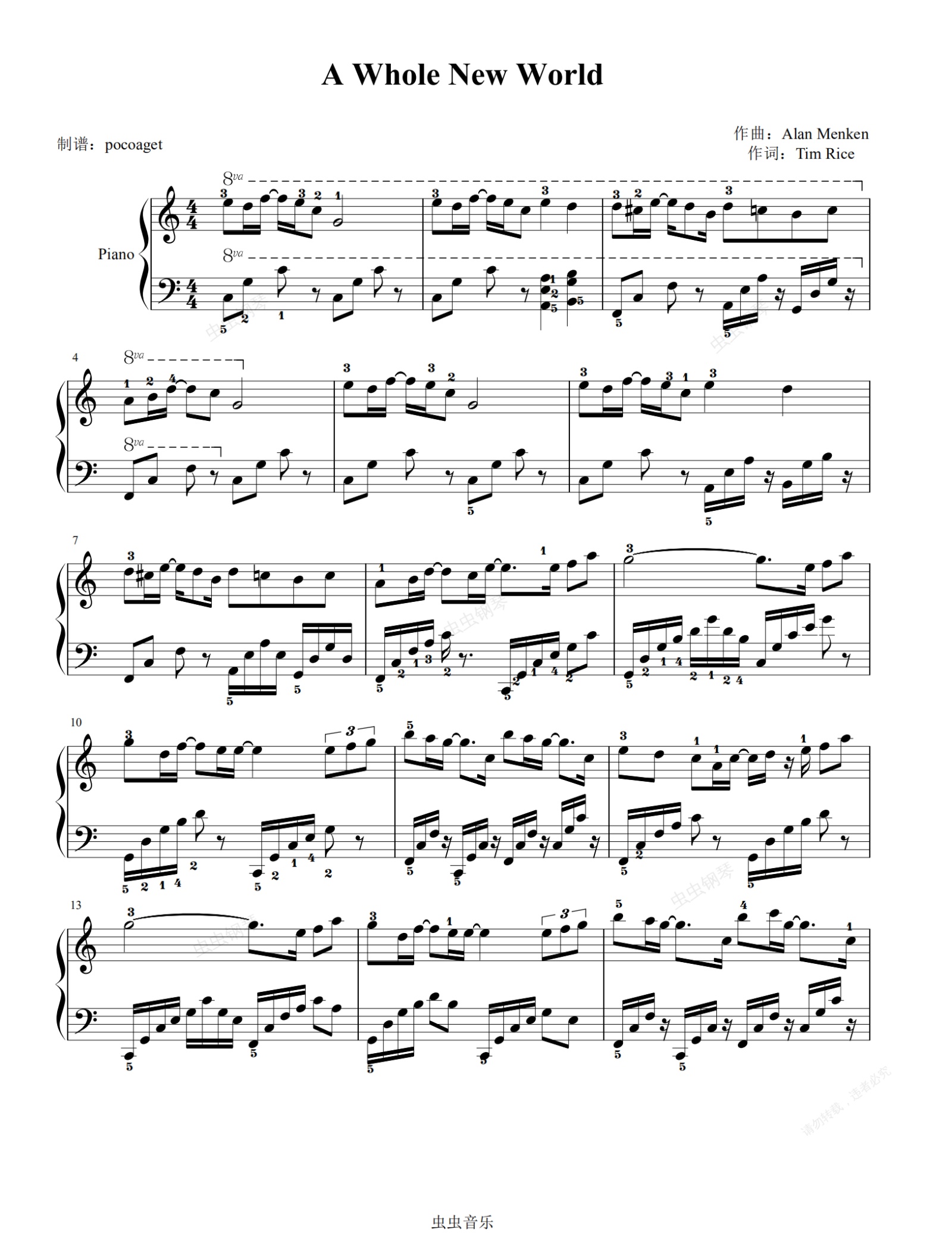 钢琴谱:《A Whole New World》阿拉丁神灯主题曲。(poc编配)