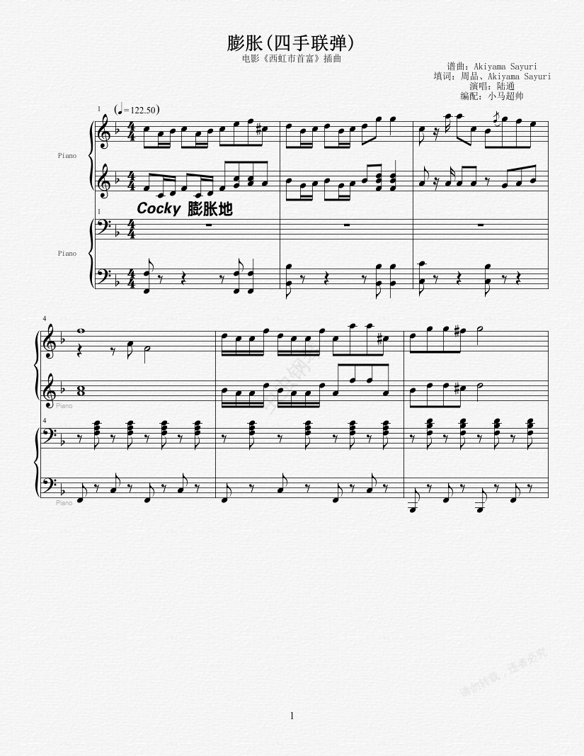 钢琴谱:电影《西虹市首富》插曲 —— 《膨胀》四手联弹