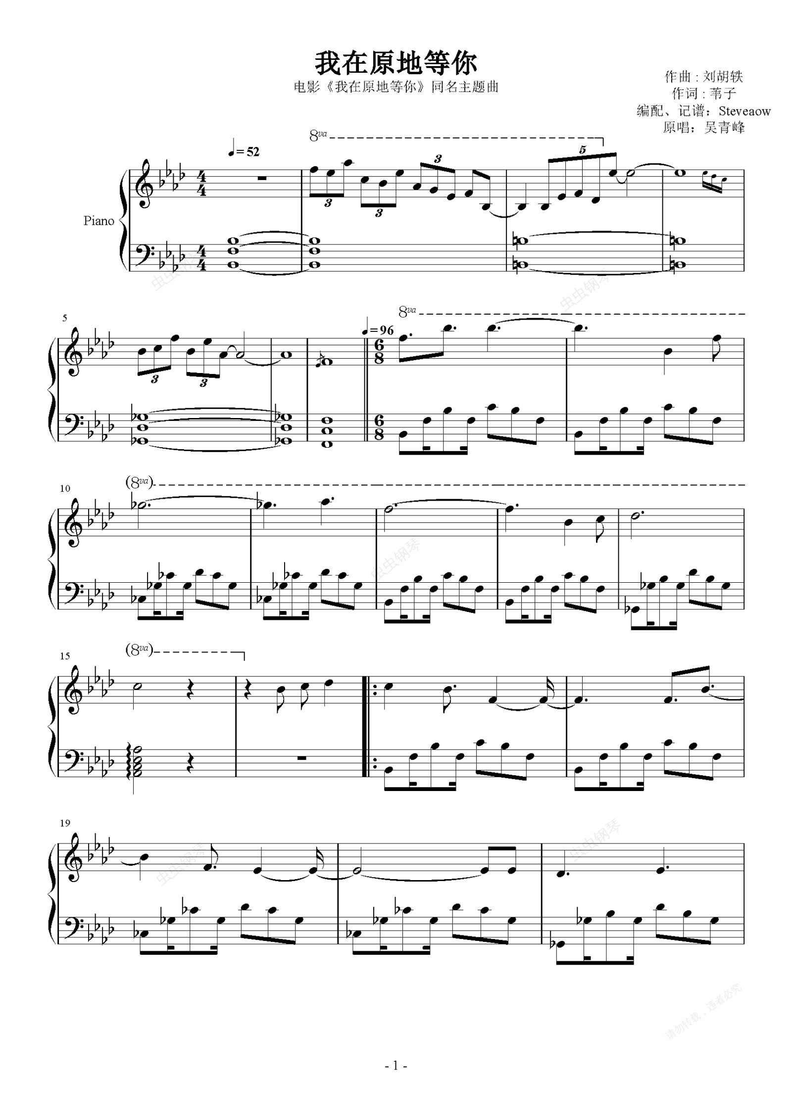 钢琴谱:我在原地等你