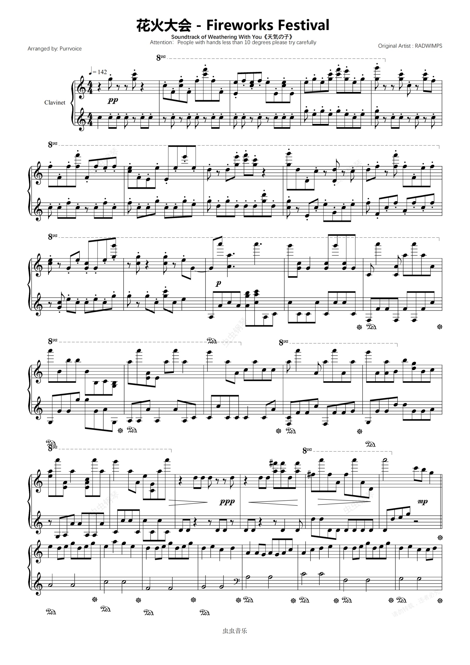 这首歌是前段时间《天气之子》在B站上映时听到的,第一次看我就被音乐和画面震撼了,阳菜面对天空的画面仿佛是摩西站在山巅分开了红海,当时我就觉得我一定要做这首歌。我在网上找到了谱子,质量还蛮高的,不过所有现有的版本都没有还原高潮部分的人声旋律和弦乐,因此我还是决定要做一个质量更高的版本出来。现在,我可以很自信的说:这是全网最还原的花火大会(当然也是最难的_(:з」∠)_,我用到了很多10度大和弦以及多声部的跑动技巧,希望你们在练的时候不要打我2333)