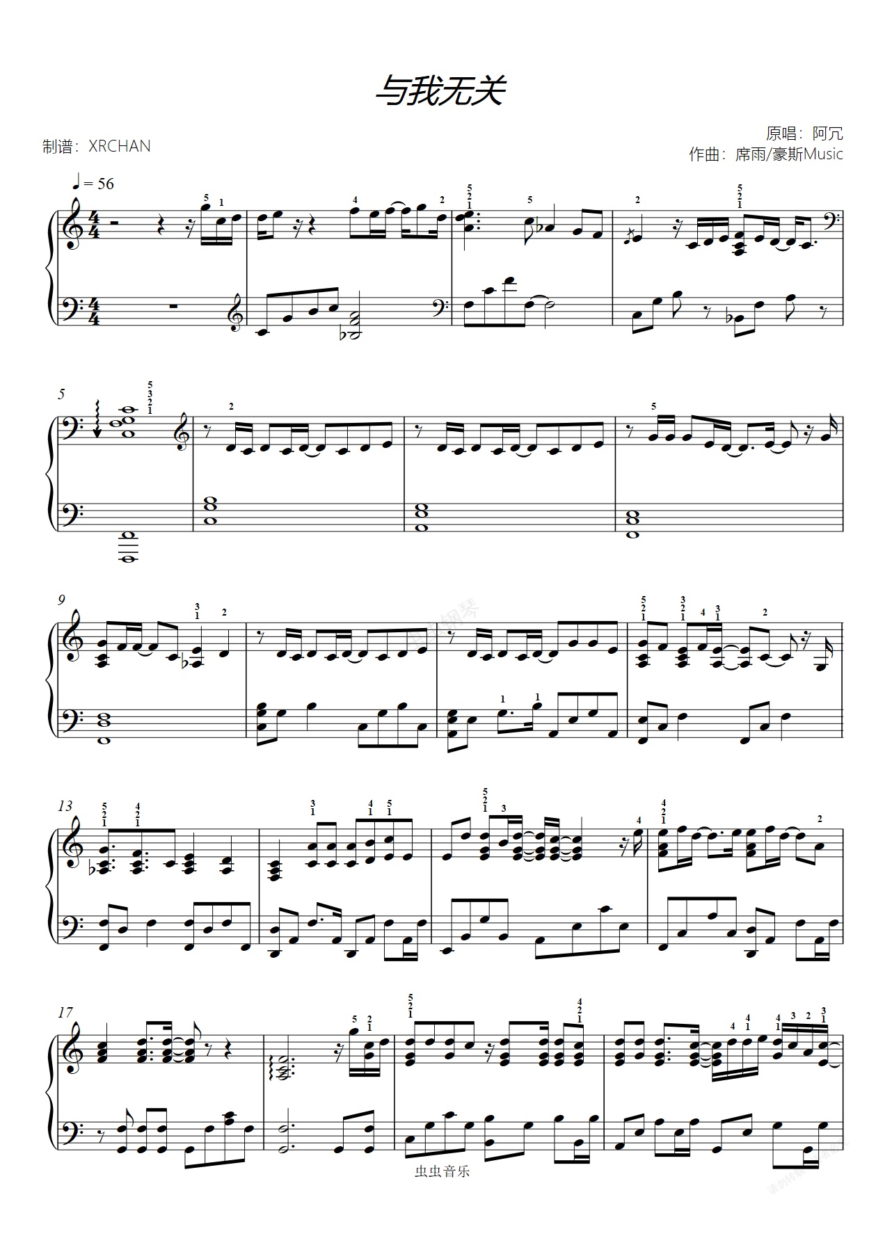 钢琴谱:阿冗《与我无关》C调 带指法(抒情好听)