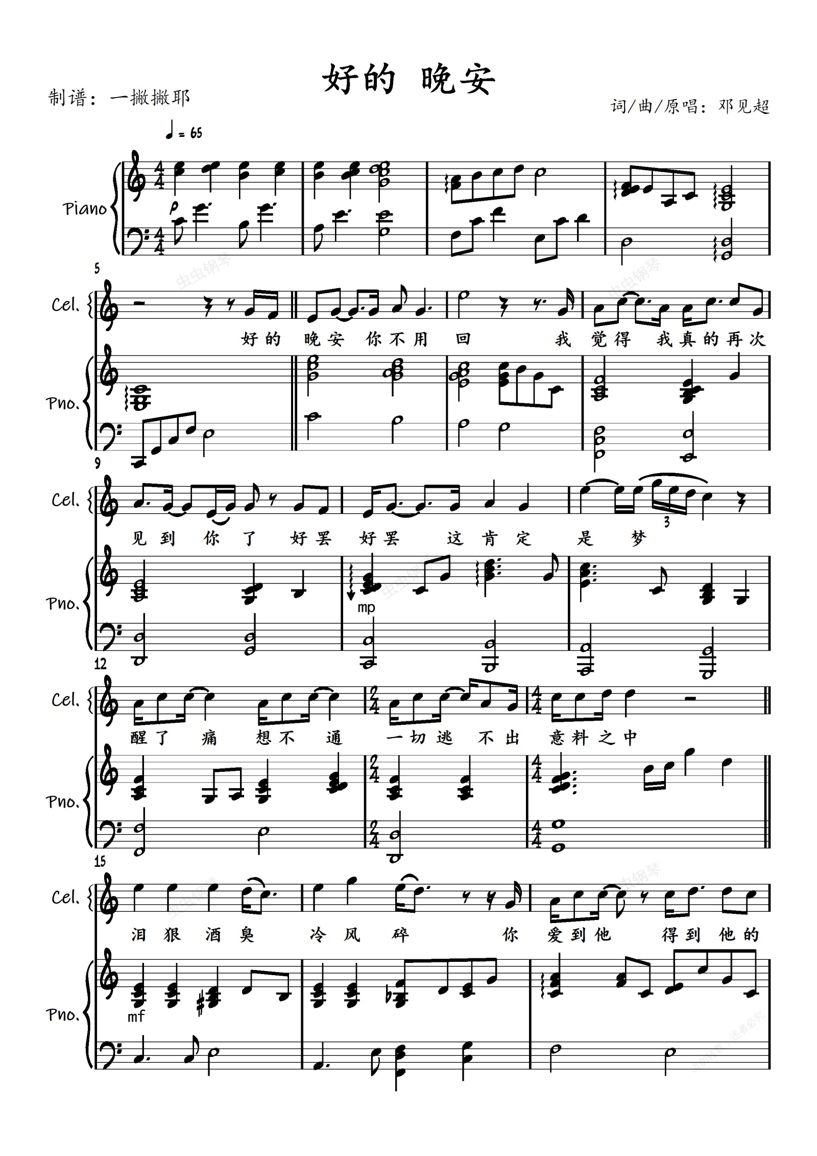 钢琴谱:好的 晚安【弹唱谱】邓见超《这!就是原创》「一撇撇耶」
