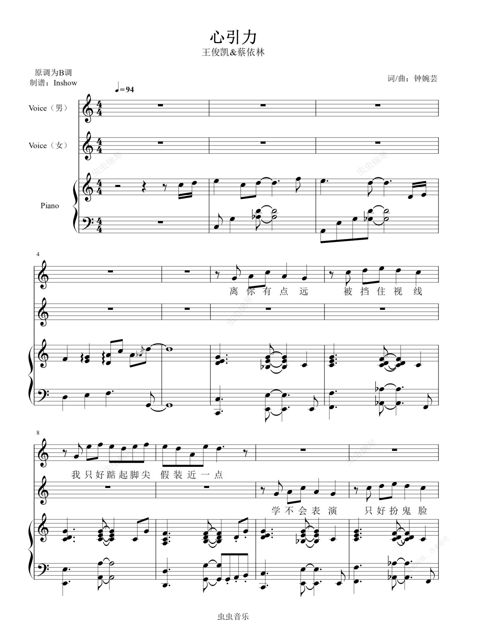 钢琴谱:心引力【C调弹唱谱】