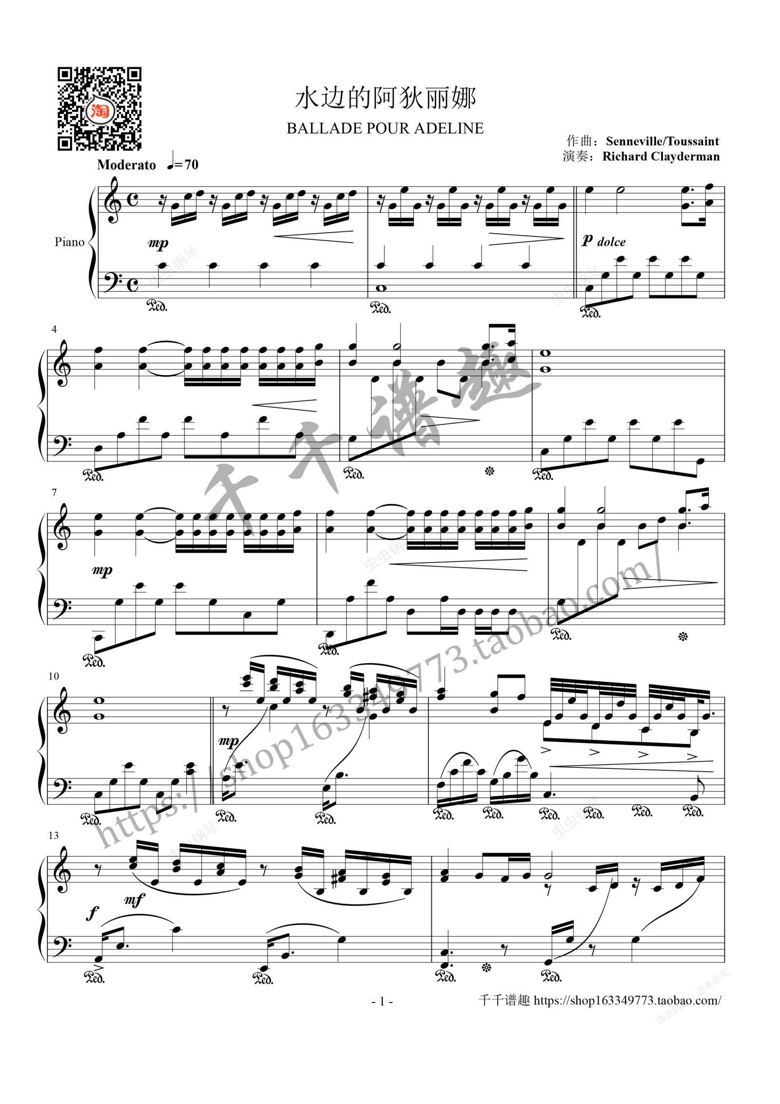 钢琴谱:水边的阿狄丽娜 C大调