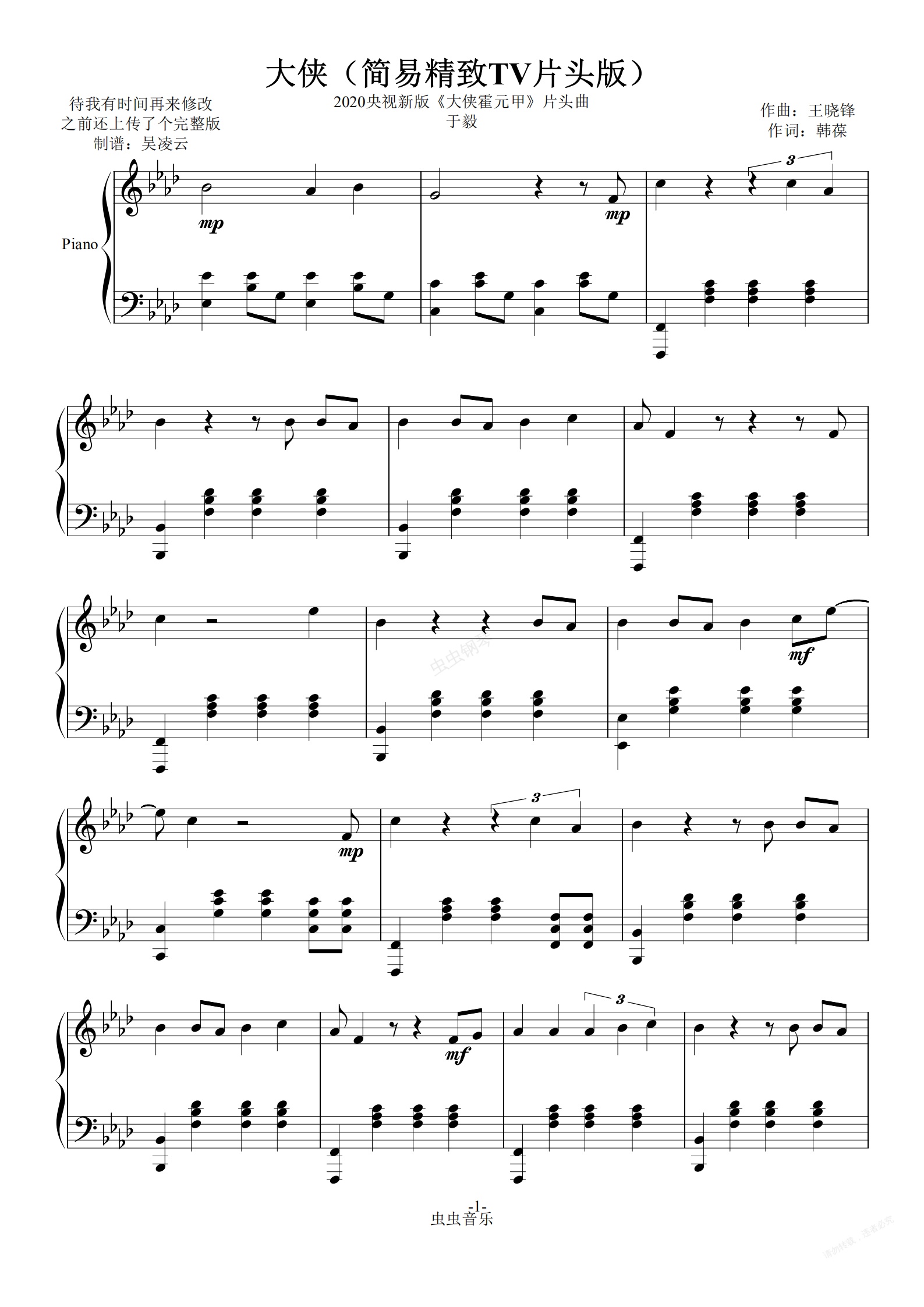 钢琴谱:大侠-于毅 TV简易精致版 2020央视《大侠霍元甲》 片头曲 吴凌云钢琴版