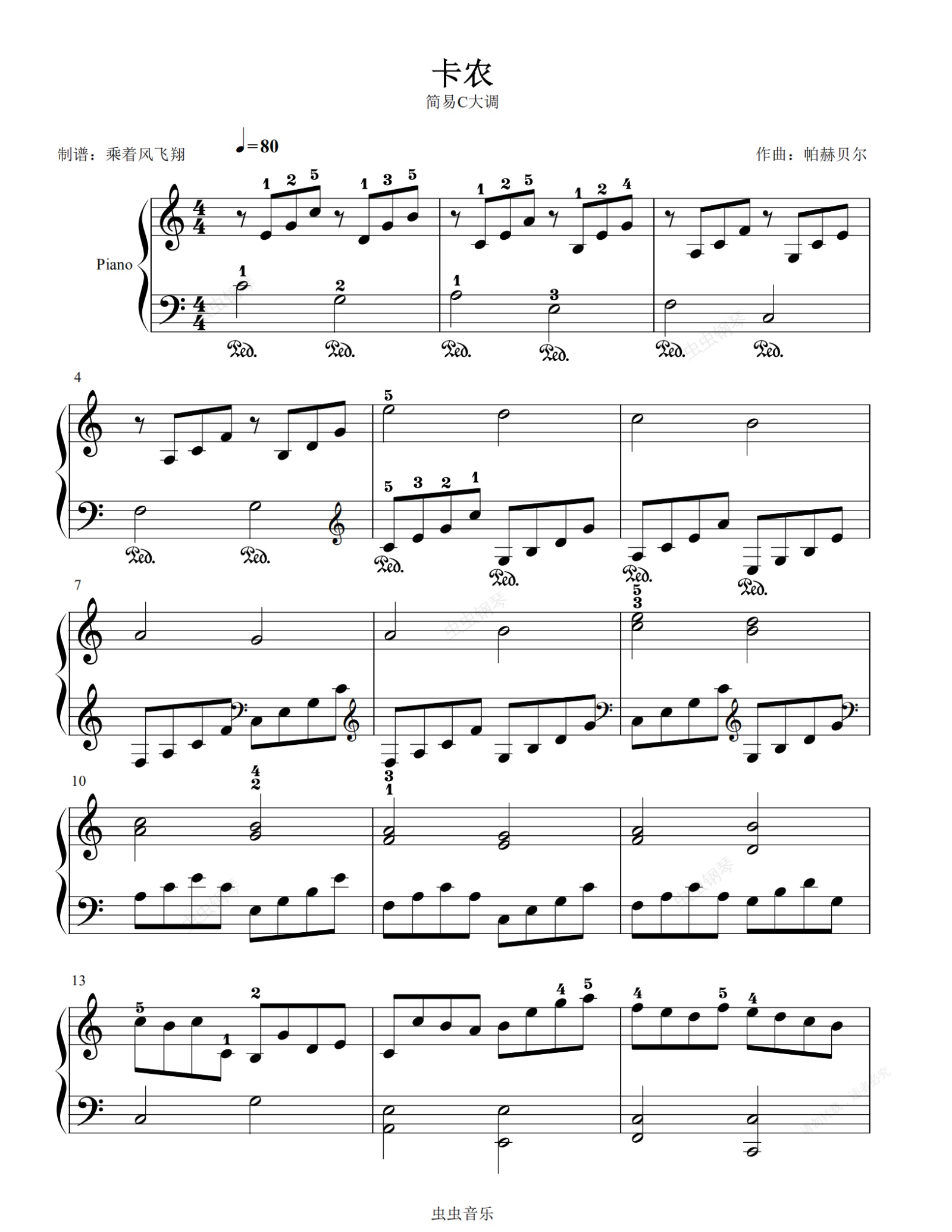 帕赫贝尔()的《D大调卡农》(Canon and Gigue in D),也称作《帕赫贝尔的卡农》('s Canon),作品编号:T. 337。通常人们更多地关注作品的第一部分卡农,('s Canon)。此曲一般的演奏法是以大提琴启奏,三把小提琴间隔八拍先后加入。小提琴全部拉奏完全相同旋律,前后仅三段不同的旋律,每段仅两小节的旋律供重复拉奏;大提琴从头到尾也仅有两小节,重复达二十八次之多。这段音乐虽然不断回旋往复,但其旋律之美不让人觉得单调,反而感觉动听悦耳。
