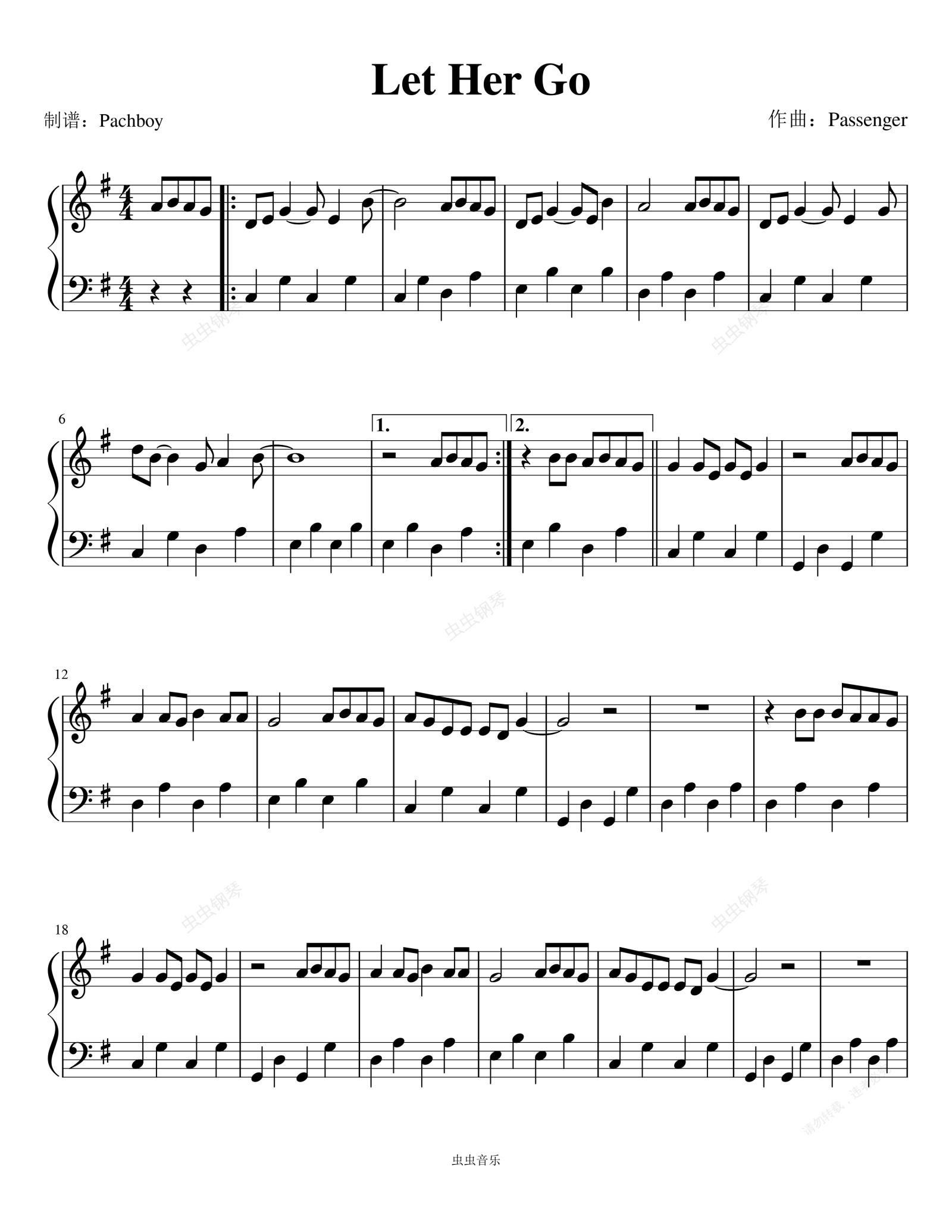 钢琴谱:Let Her Go(让她走吧)Passenger