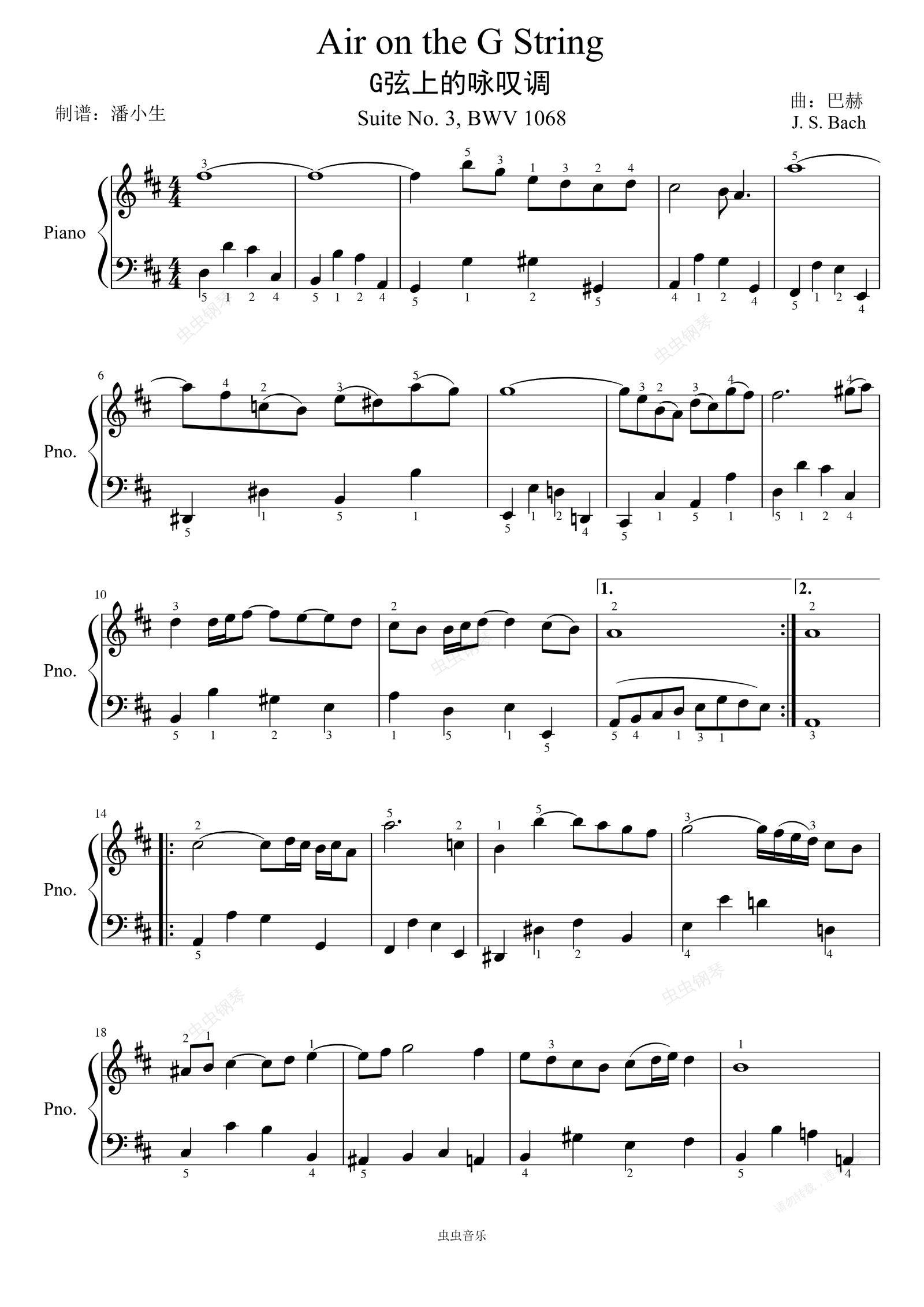 钢琴谱:巴赫 G弦上的咏叹调 带指法 高清原版重制《G弦之歌》Air on the G No.3_BWV_1068