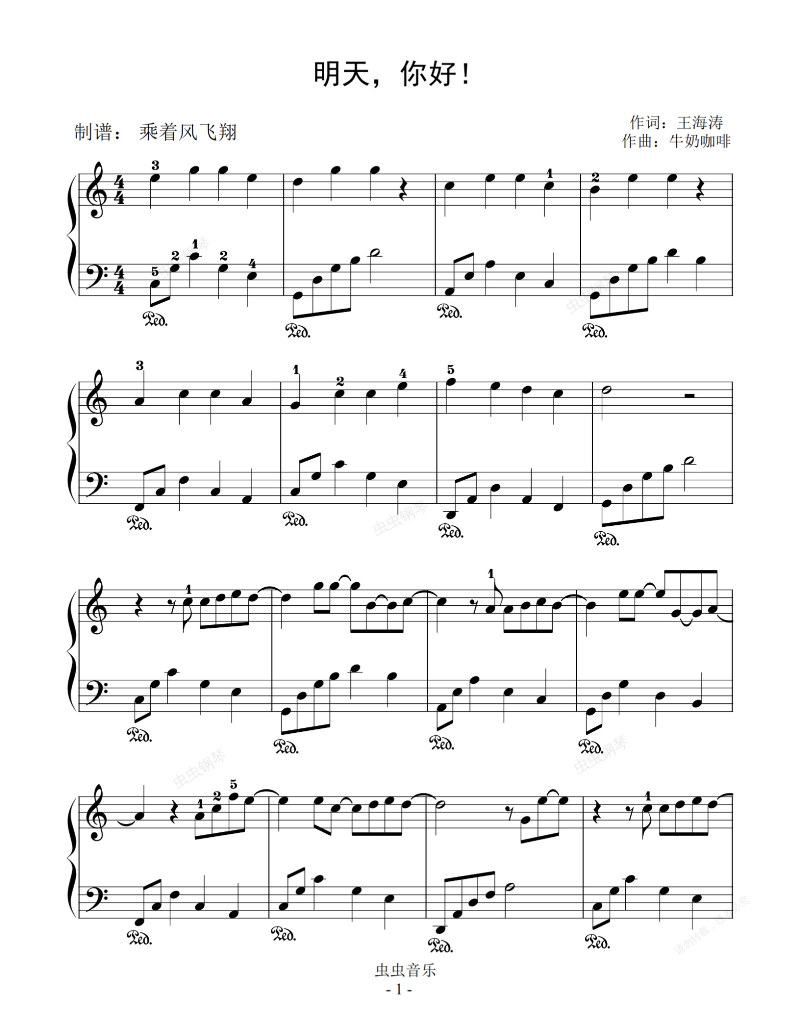 钢琴谱:明天,你好!--牛奶咖啡