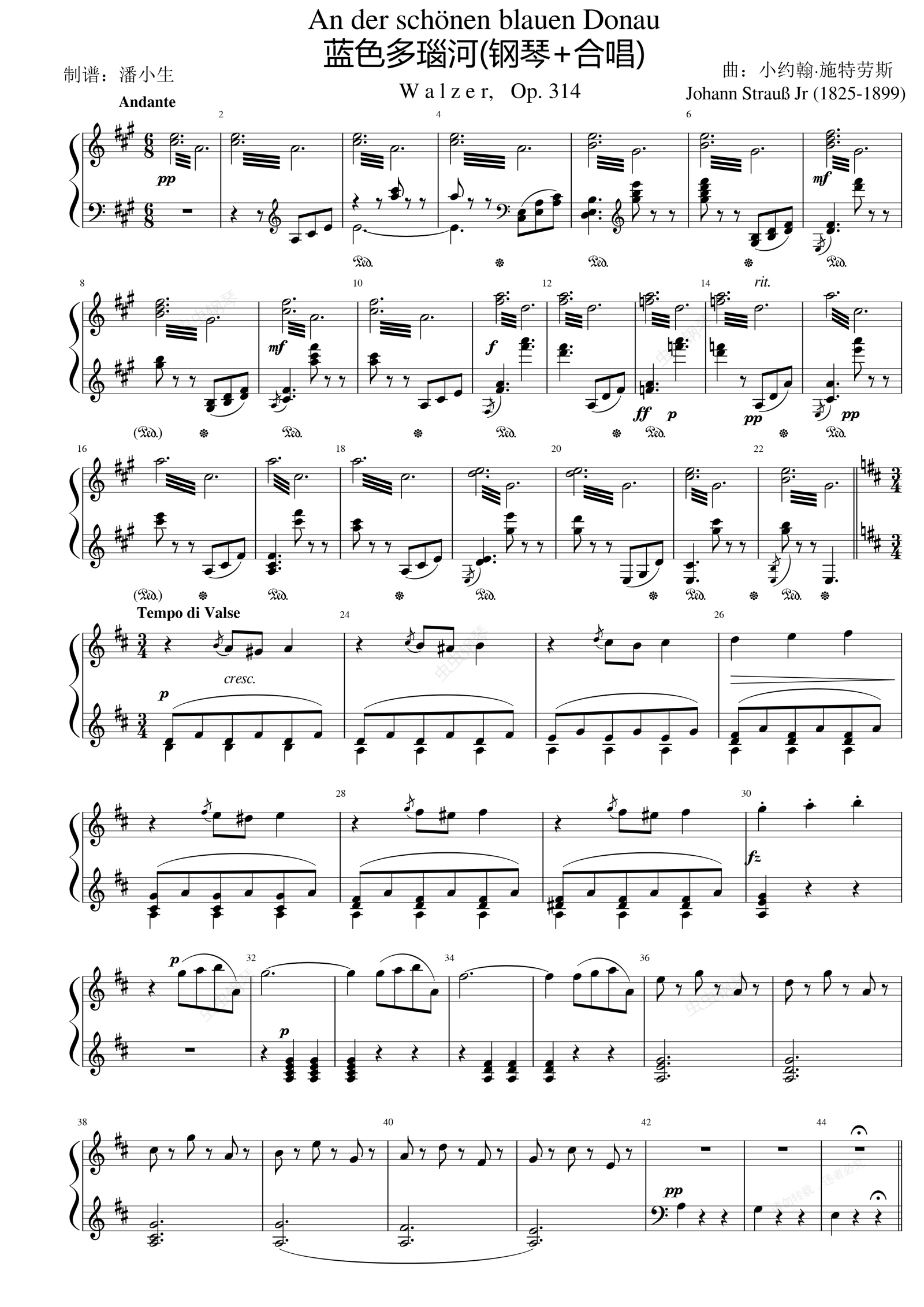 钢琴谱:蓝色多瑙河 钢琴合唱谱 高清(施特劳斯圆舞曲)Op.314 The Blue Danube