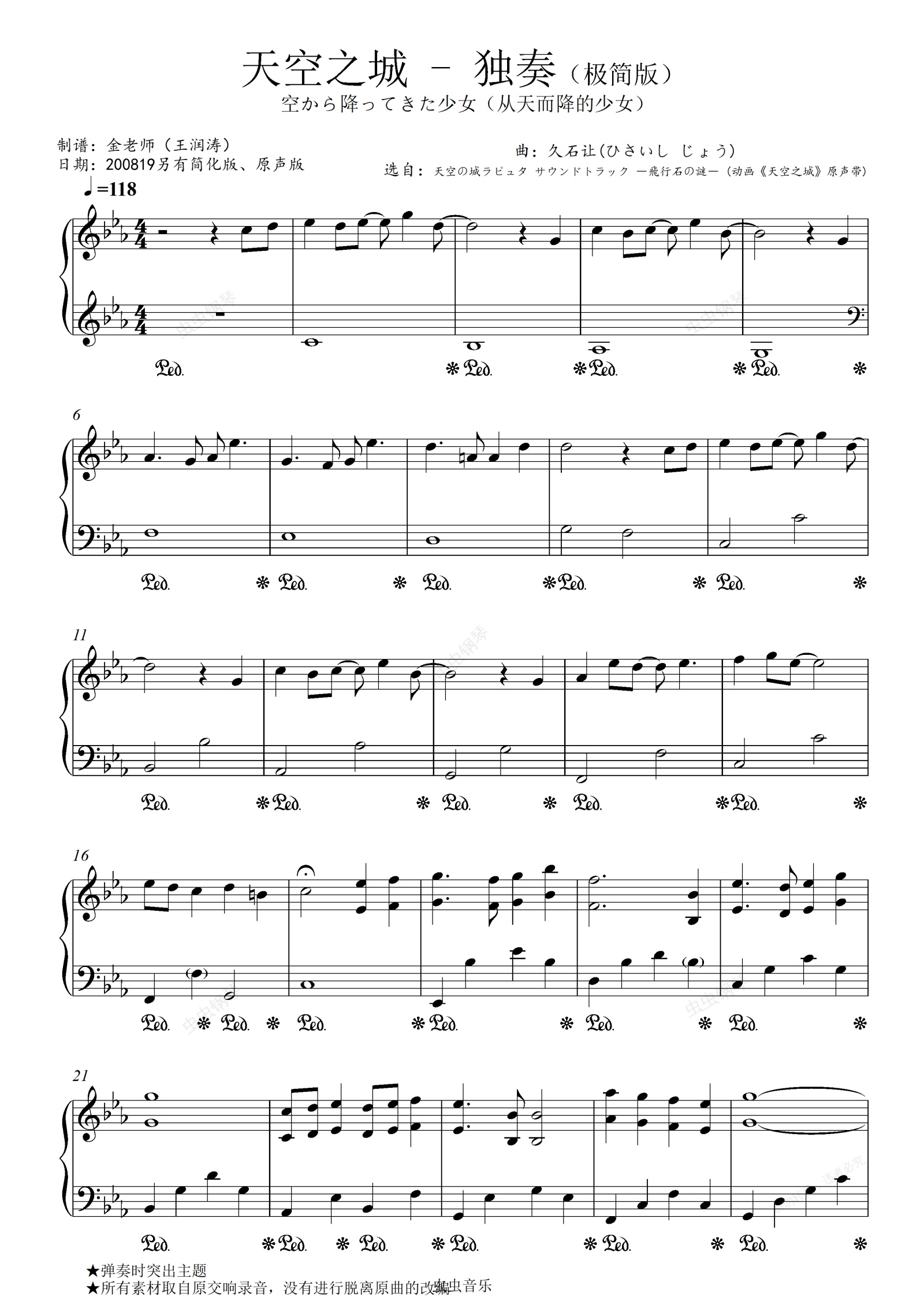 钢琴谱:天空之城-金老师(极简)独奏谱