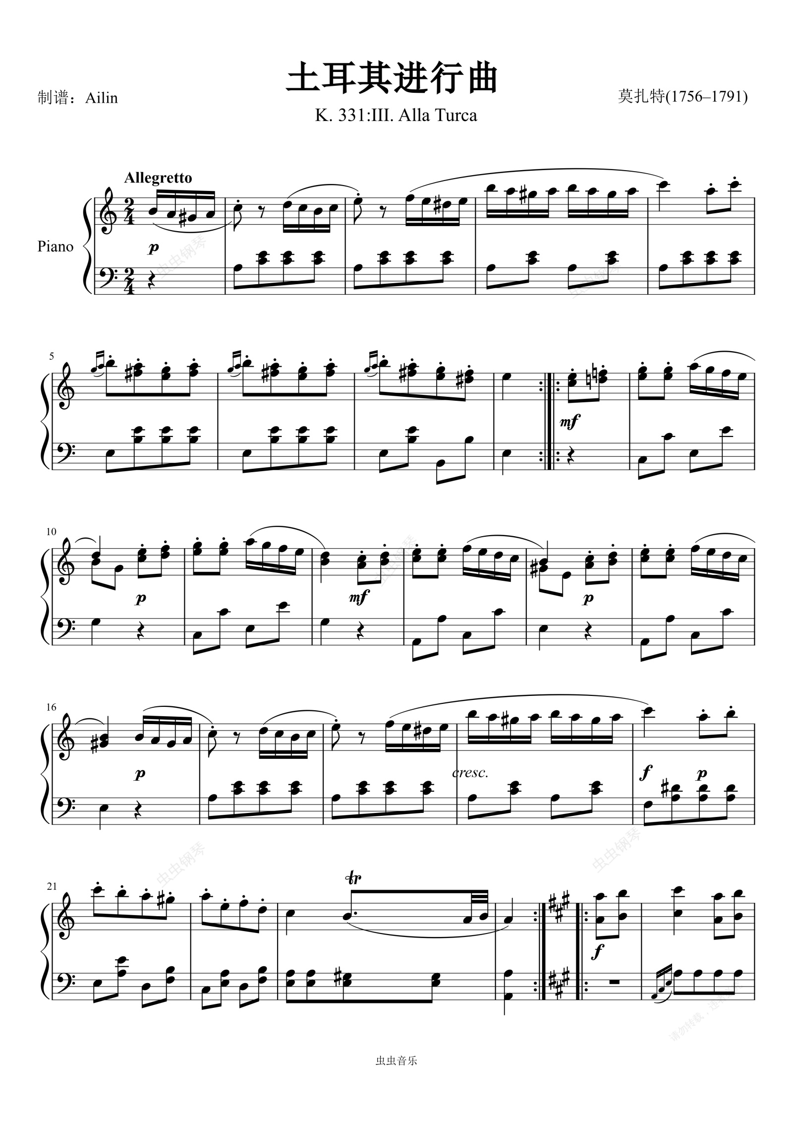 钢琴谱:土耳其进行曲【原版】莫扎特 Alla Turca 土耳其风回旋曲 Sonata No. 11 in A Major for Piano, K. 331:III. Alla Turca:Allegretto