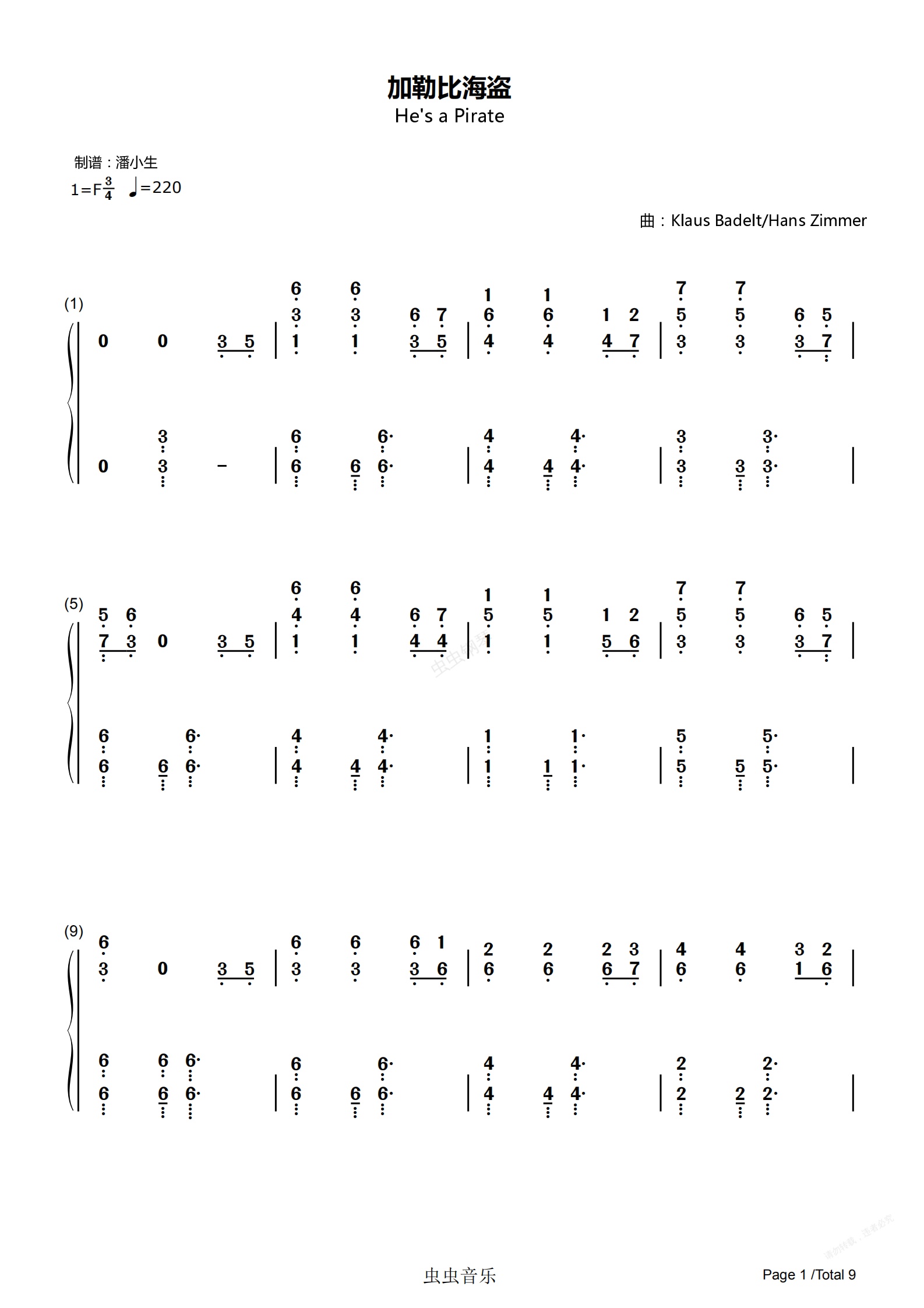 钢琴谱:[双手简谱] He is a Pirate 加勒比海盗主题曲 原调 F调