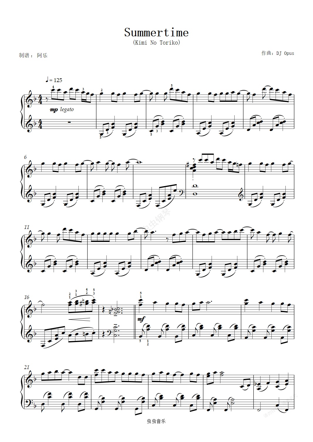 钢琴谱:Kimi No Toriko - Summertime - 夏日时光 - 带指法 - 抖音