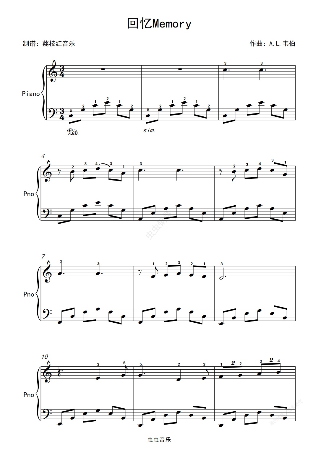 钢琴谱:回忆Memory 完整版 C大调 标指法