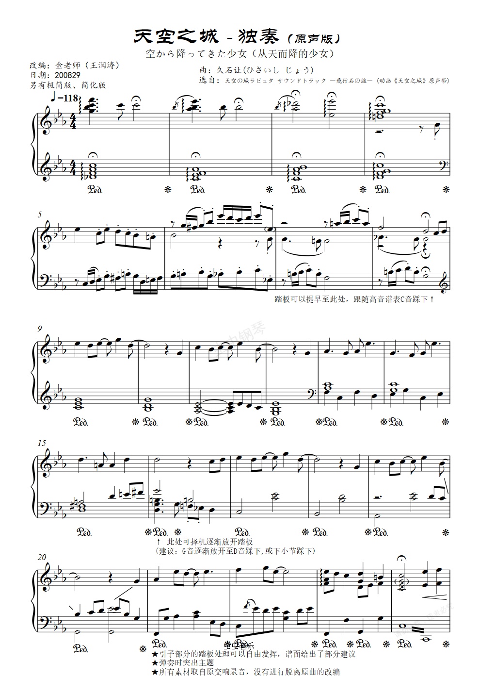 钢琴谱:天空之城-金老师(原声)独奏谱
