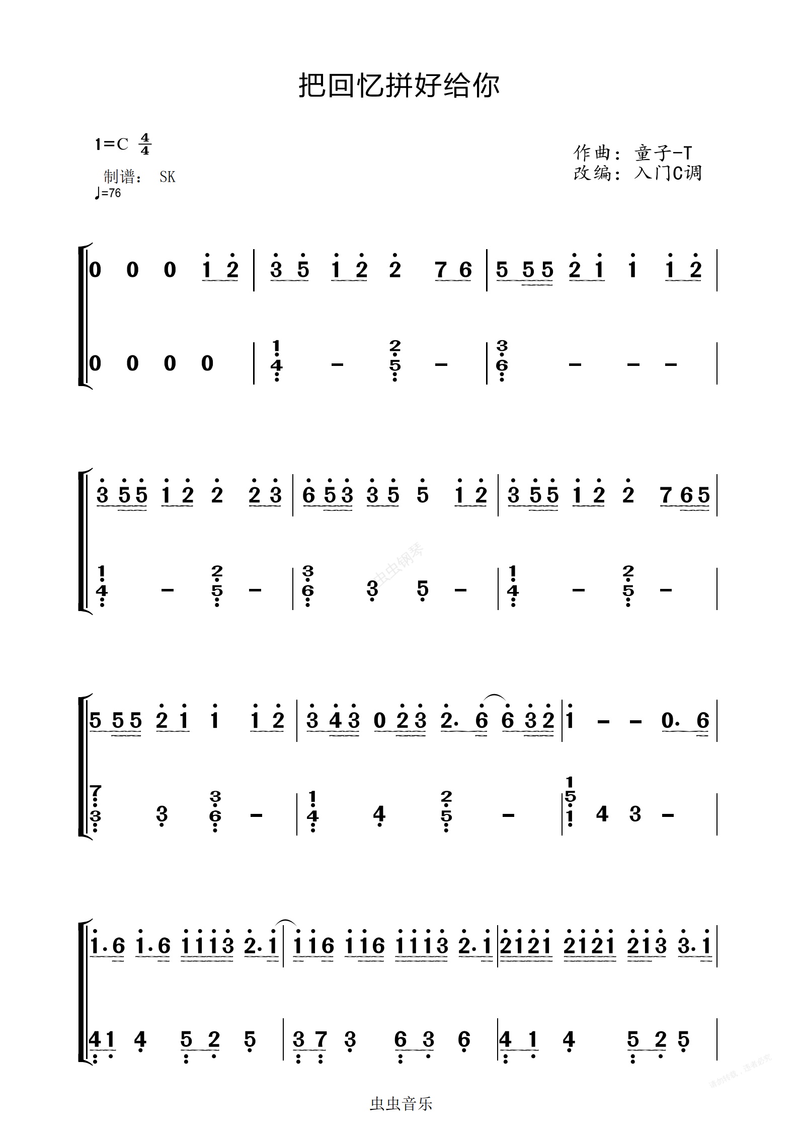 钢琴谱:王贰浪《把回忆拼好给你》C调简单版简谱