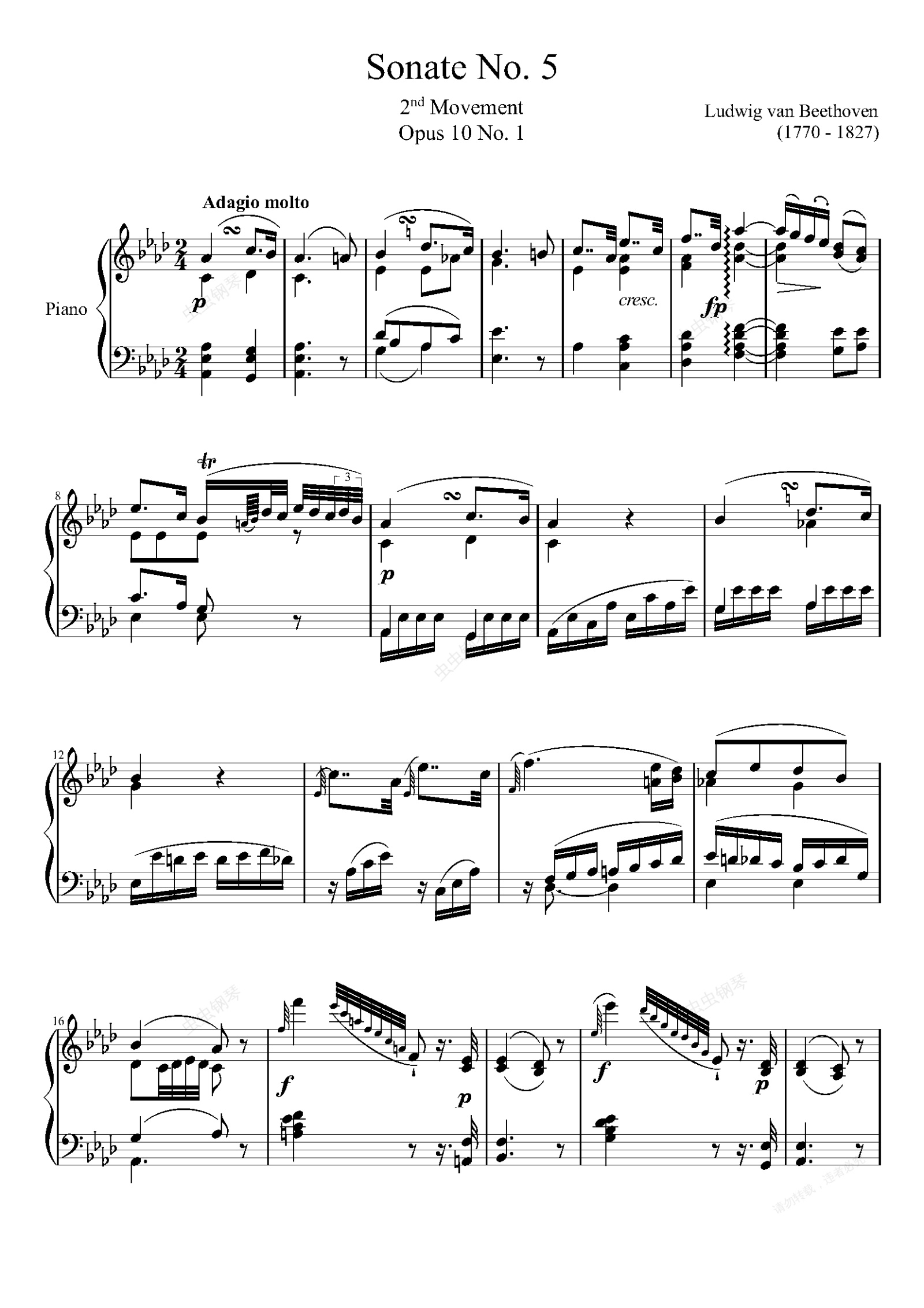 钢琴谱:贝多芬第五钢琴奏鸣曲(第二乐章)——Op.10-No.1