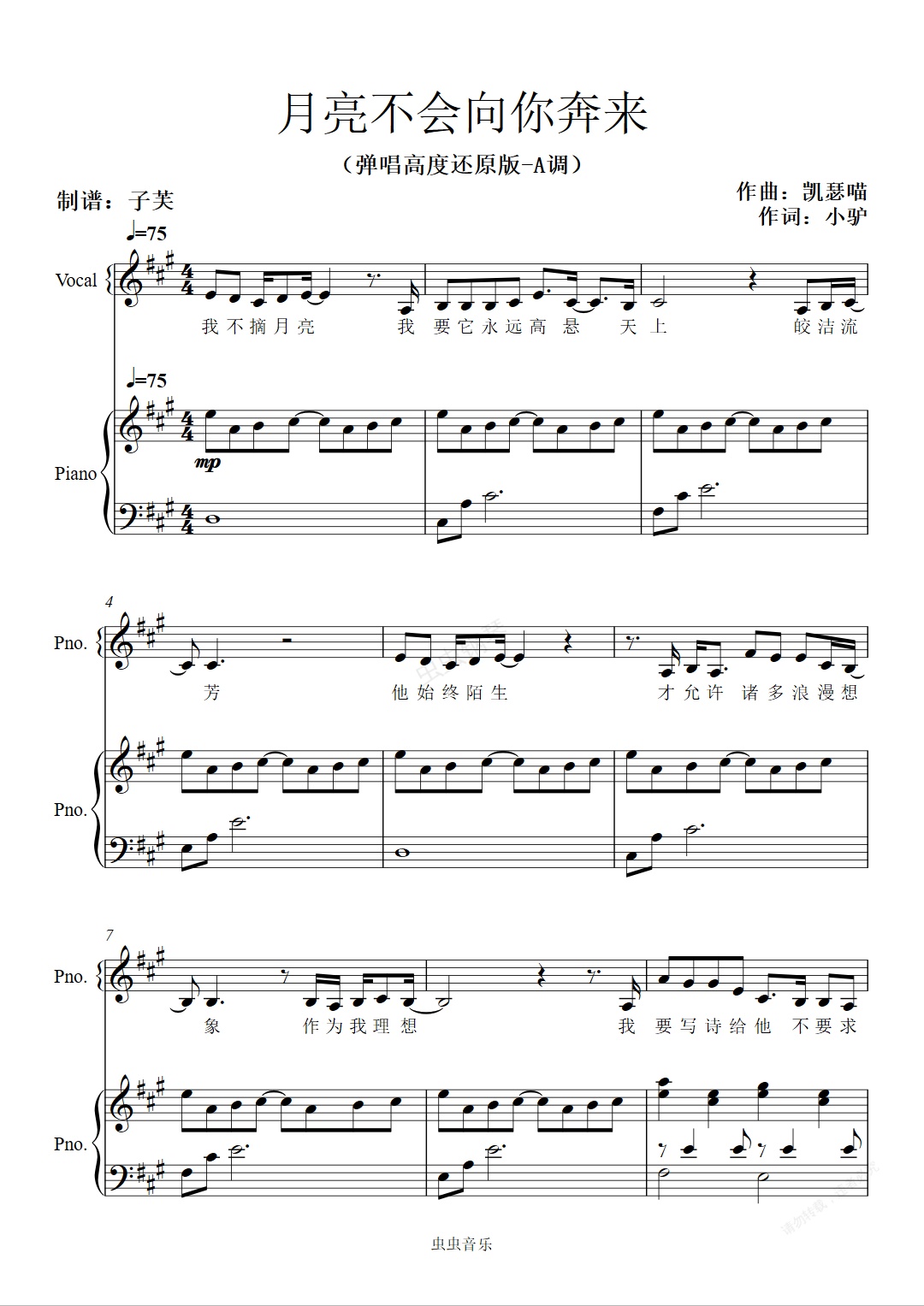 钢琴谱:《月亮不会向你奔来》-凯瑟喵-弹唱高度还原版A调