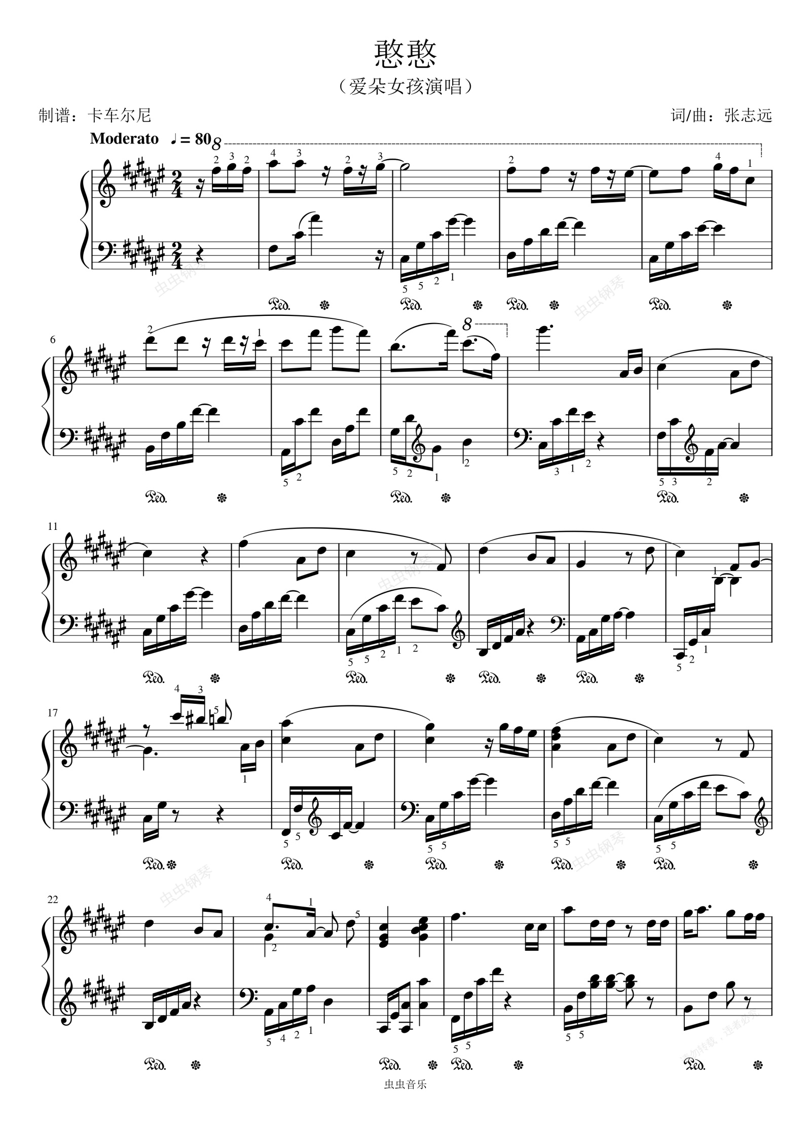 钢琴谱:《憨憨》 爱朵女孩演唱 钢琴独奏好听版【带指法】