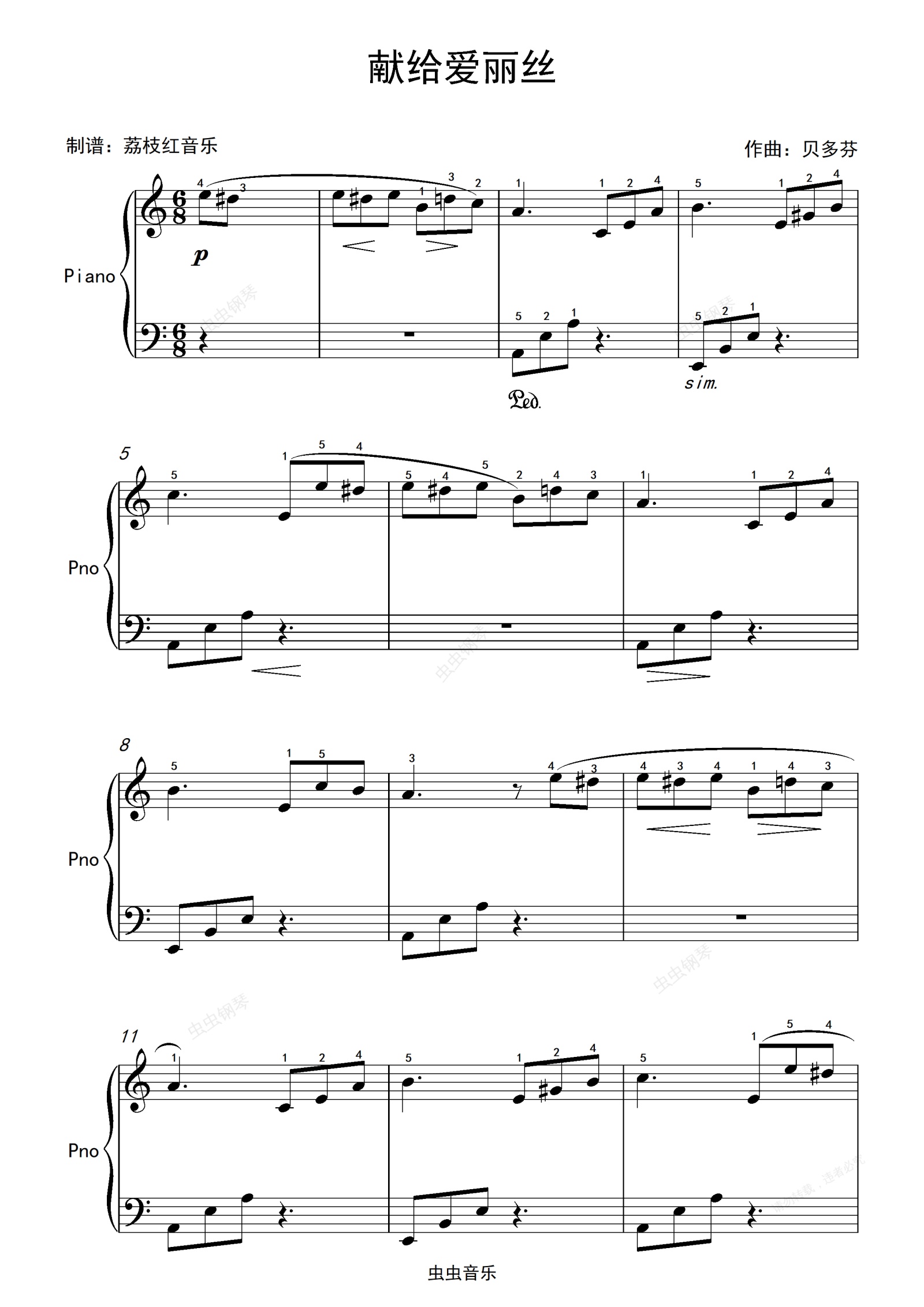 钢琴谱:高清 C调 献给爱丽丝 独奏钢琴谱 简单易学