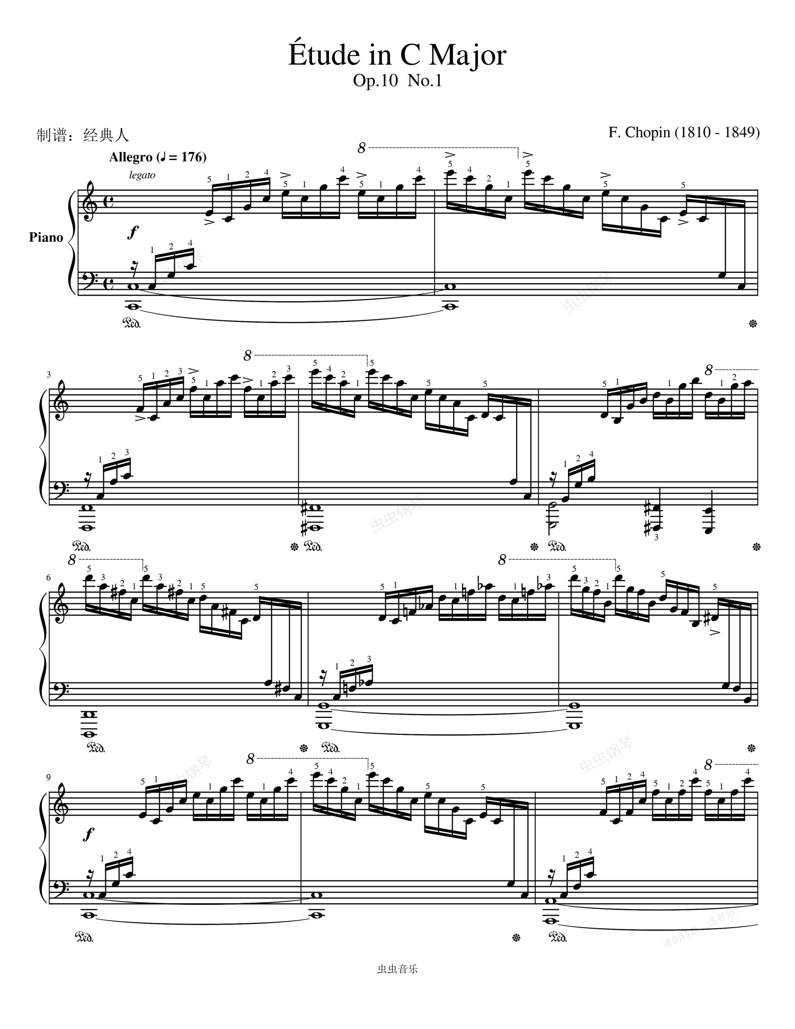 钢琴谱:Etudes, Op.10 No.1 in C-Chopin 肖邦练习曲 逃亡圣咏曲 肖邦C大调练习曲 作品10第一首(第一号)Waterfall