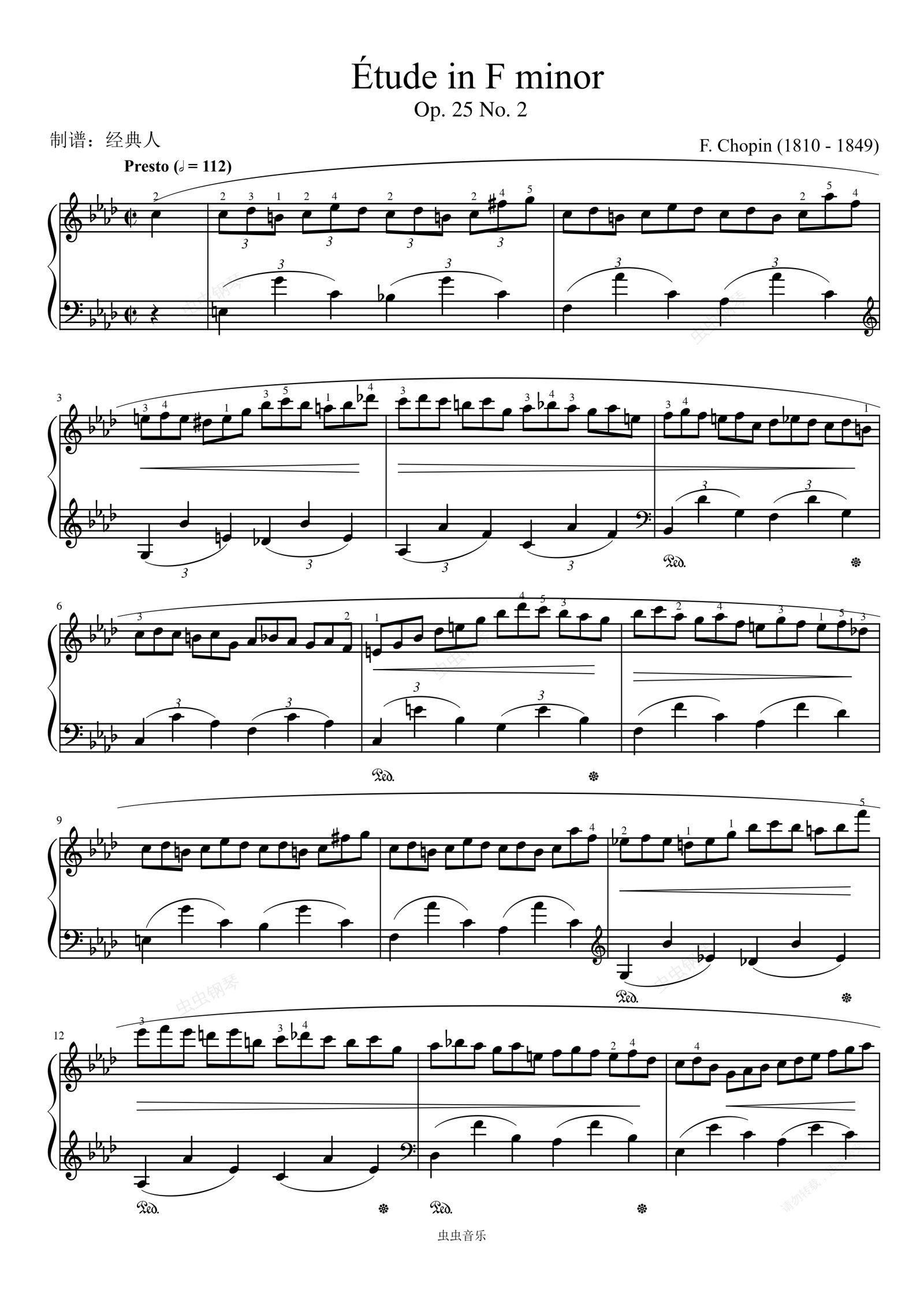 钢琴谱:Etudes, Op.25 No.2 in F minor-Chopin 肖邦练习曲 肖邦f小调练习曲 作品25第2首(第2号)The Bees 肖邦蜜蜂练习曲