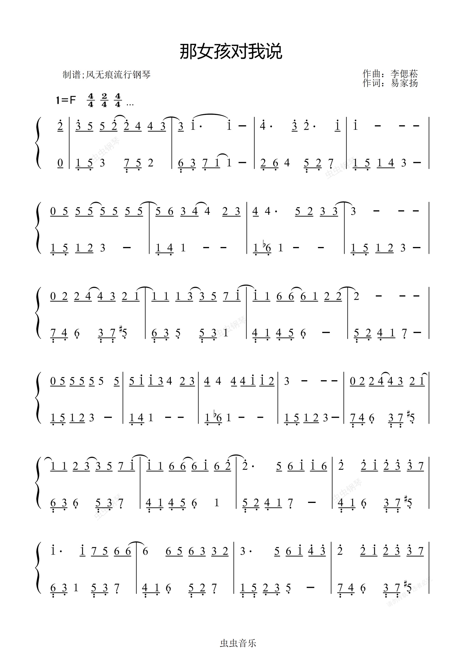 钢琴谱:那女孩对我说-黄义达〖数字简谱〗