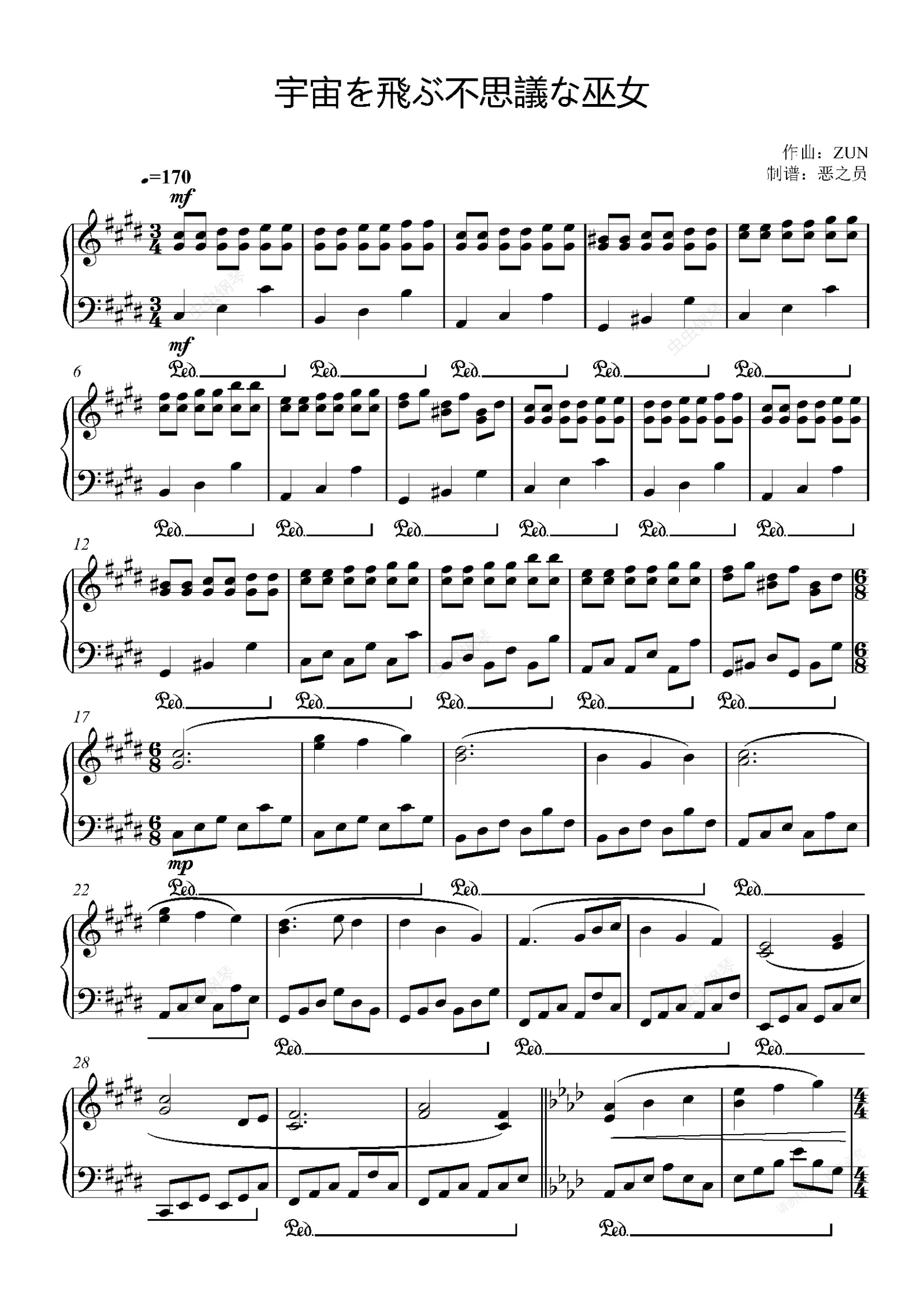 钢琴谱:宇宙を飛ぶ不思議な巫女/飞翔于宇宙的不可思议巫女