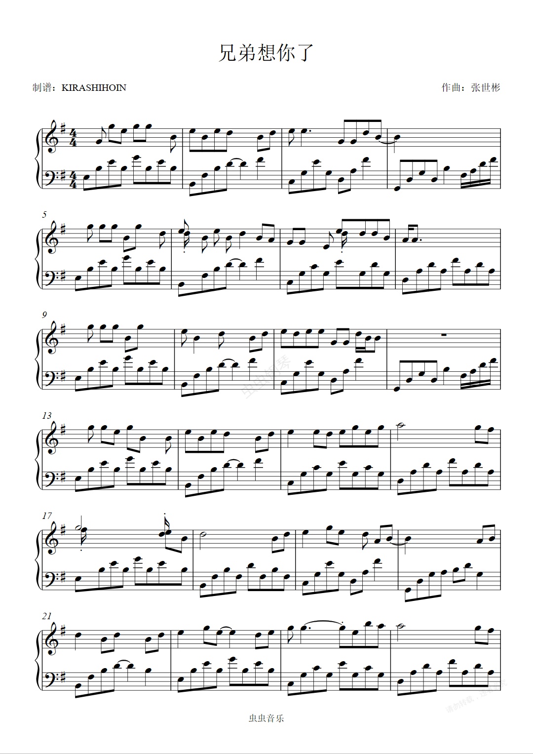钢琴谱:兄弟想你了