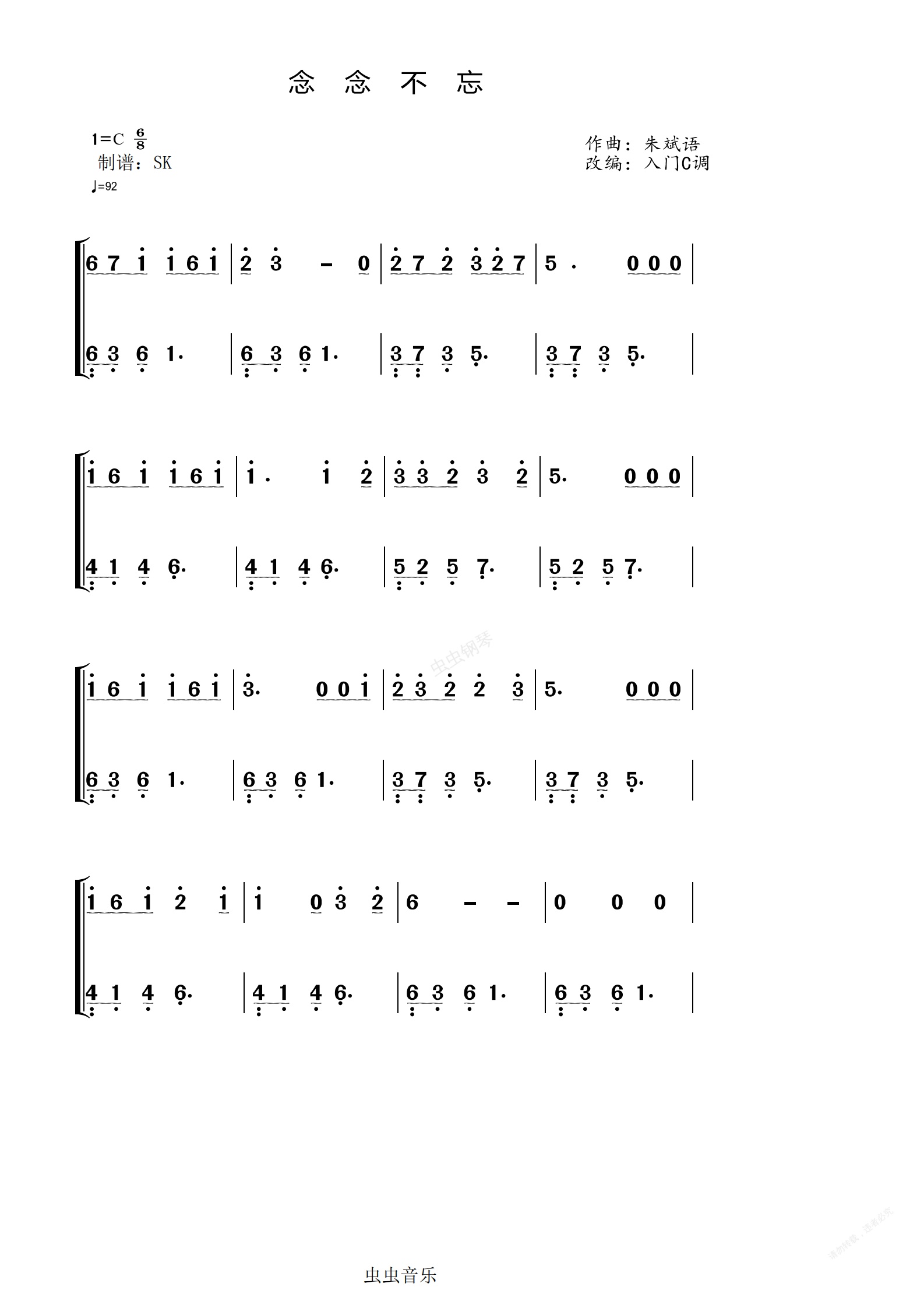 钢琴谱:不够《念念不忘》入门C调简谱