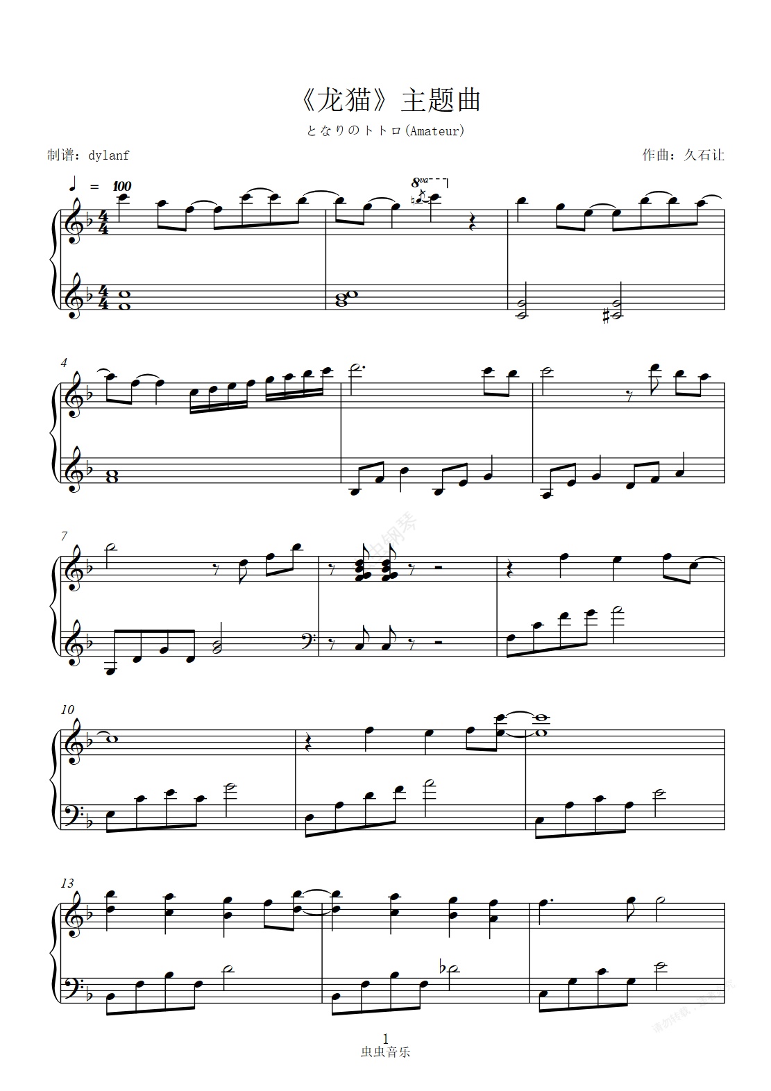 钢琴谱:龙猫主题曲(经典简易版)好听好弹