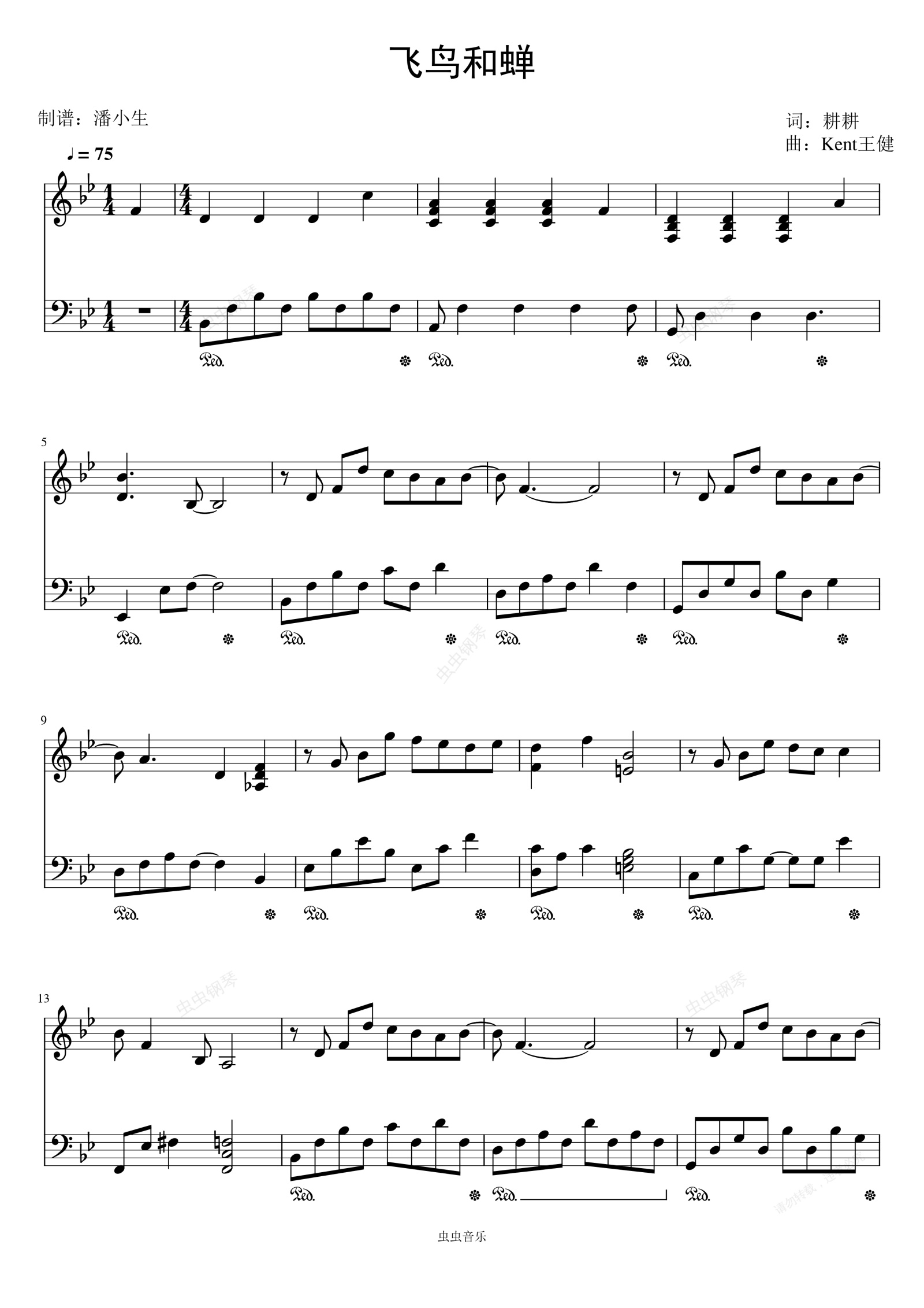钢琴谱:飞鸟和蝉 柔情版 任然 原调