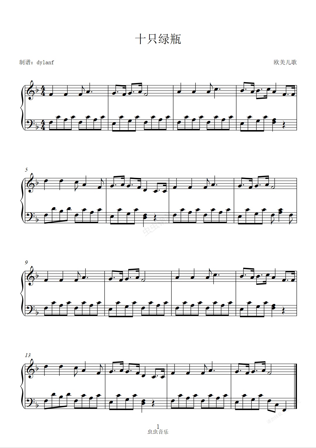 钢琴谱:十只绿瓶 经典儿歌 琴童专用