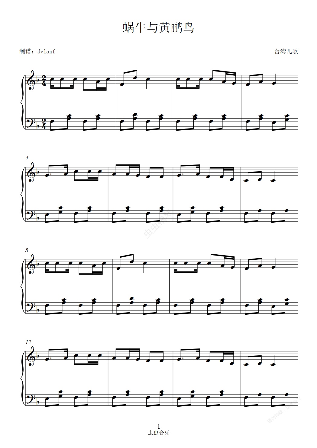钢琴谱:蜗牛与黄鹂鸟 经典儿歌 琴童专用