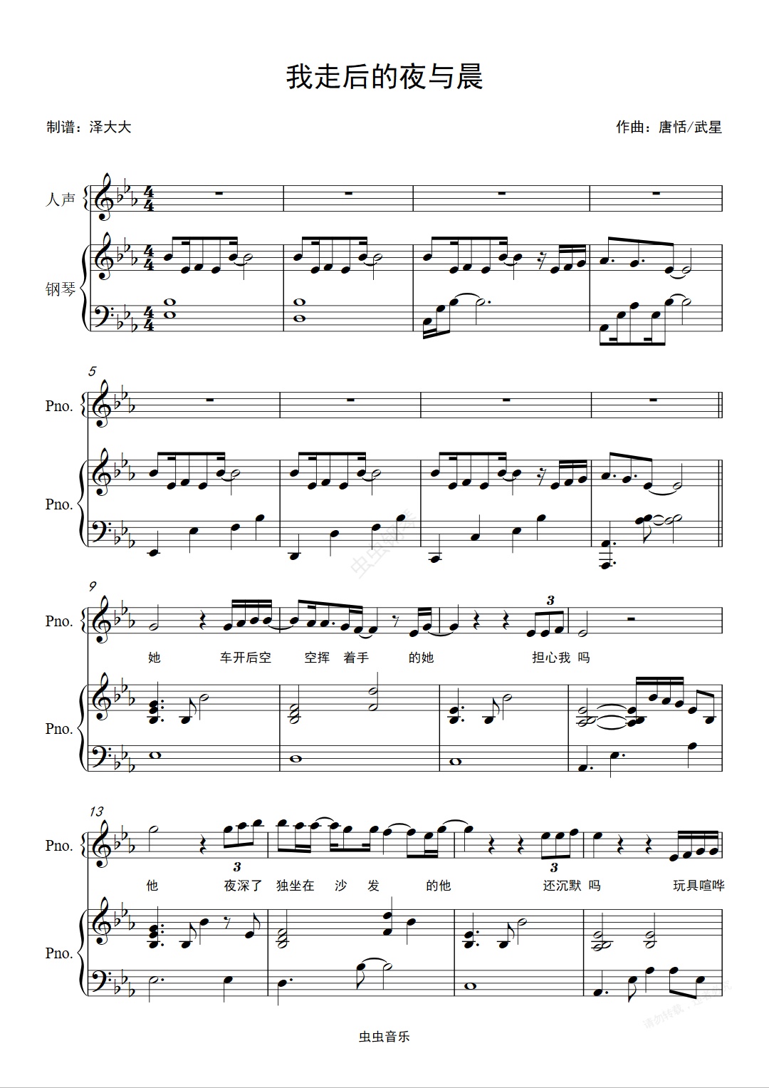 钢琴谱:我走后的夜与晨【完美伴奏附词】