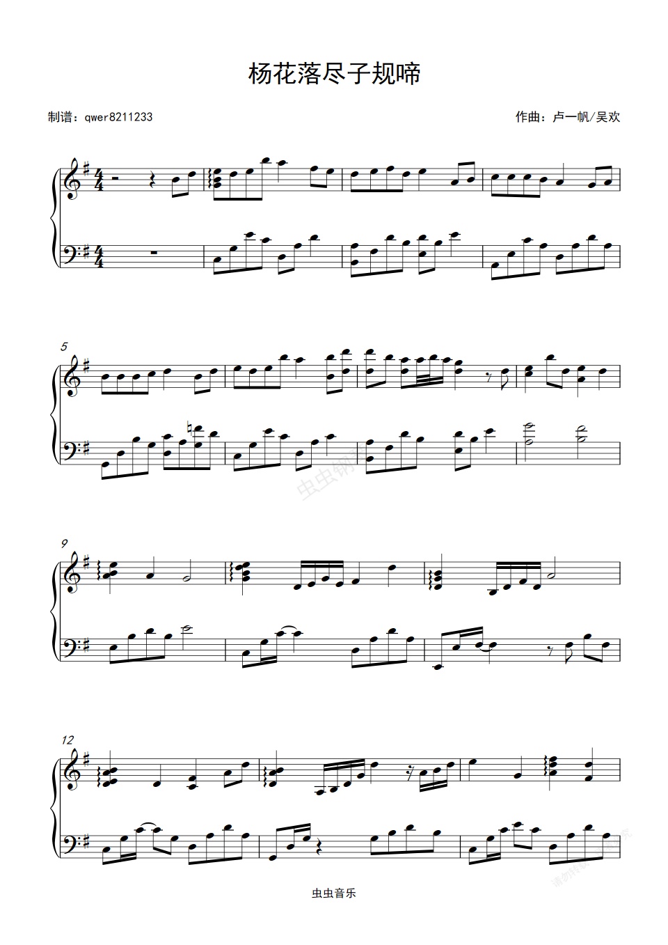 钢琴谱:【昼夜、钢琴】杨花落尽子规啼