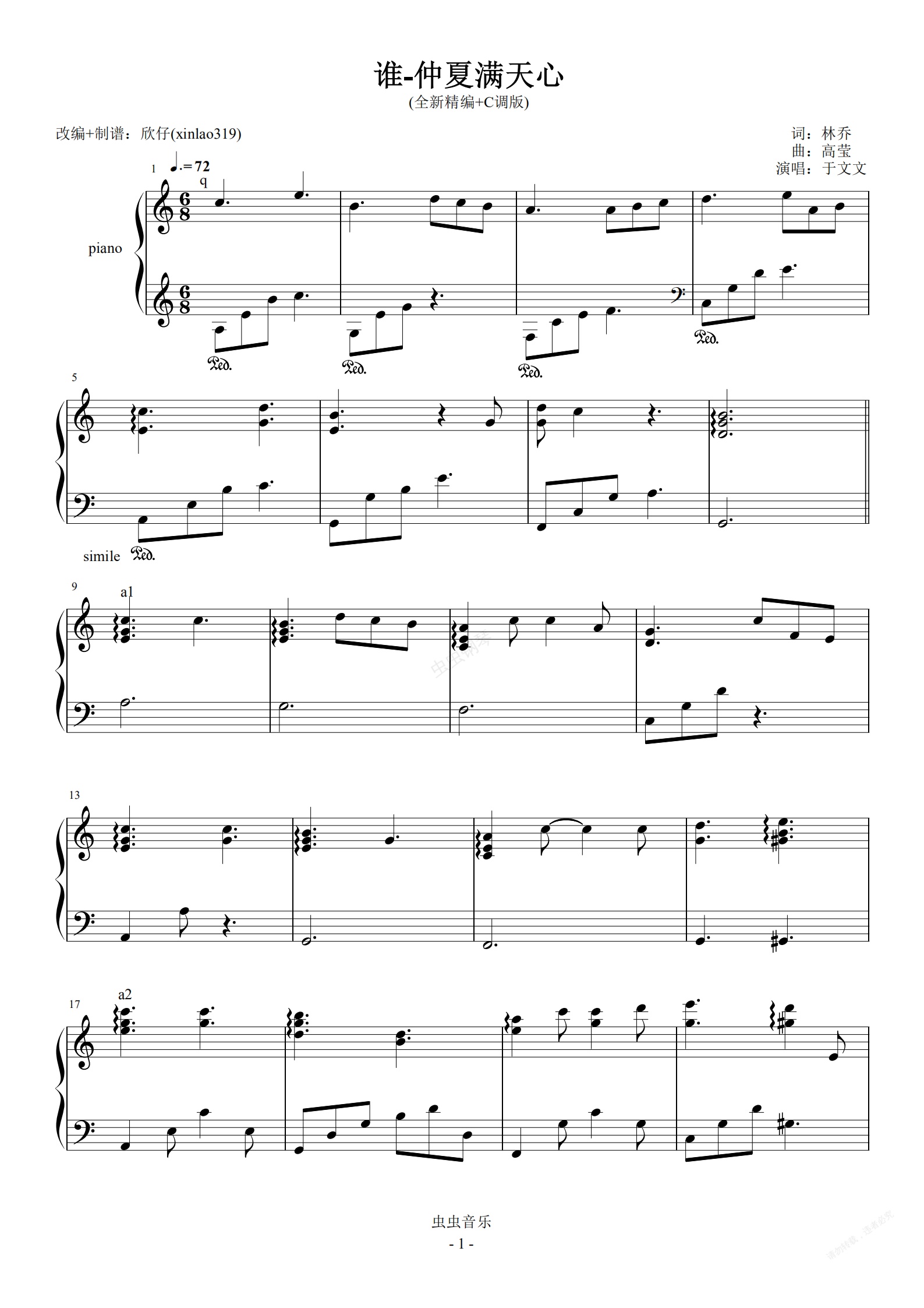 钢琴谱:长久—C调独奏《仲夏满天心》片头曲