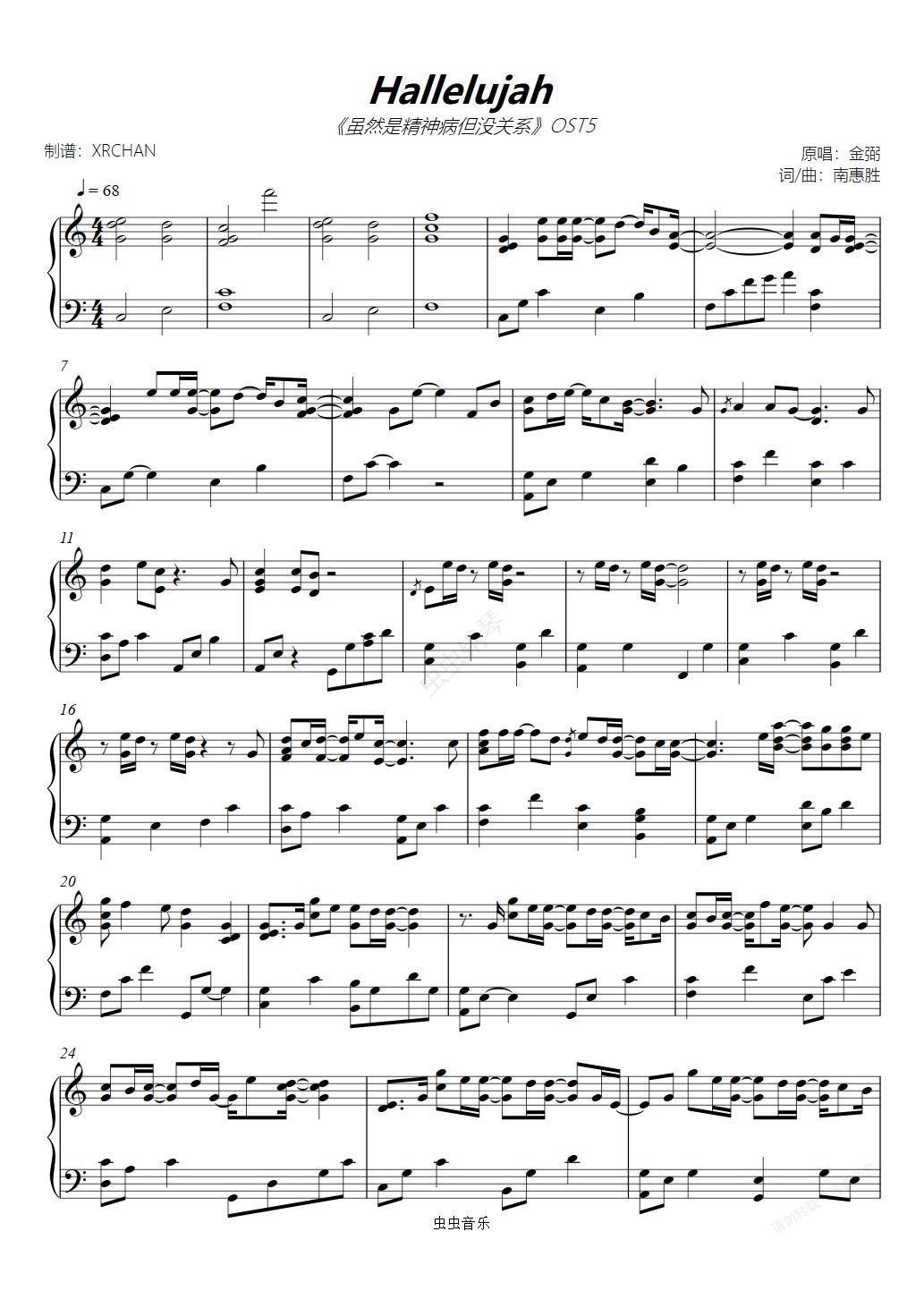 钢琴谱:Hallelujah《虽然是精神病但没关系》OST5 C调