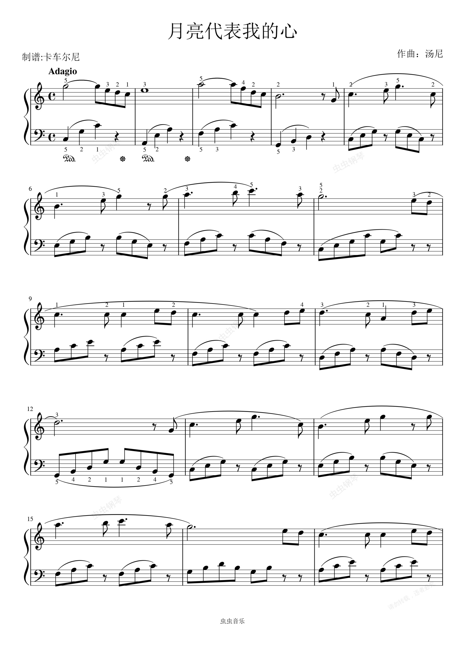 钢琴谱:月亮代表我的心 C调简易版 带指法