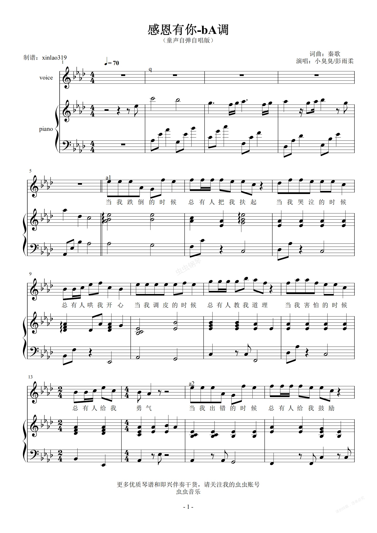 钢琴谱:感恩有你-降A(童声)自弹自唱版