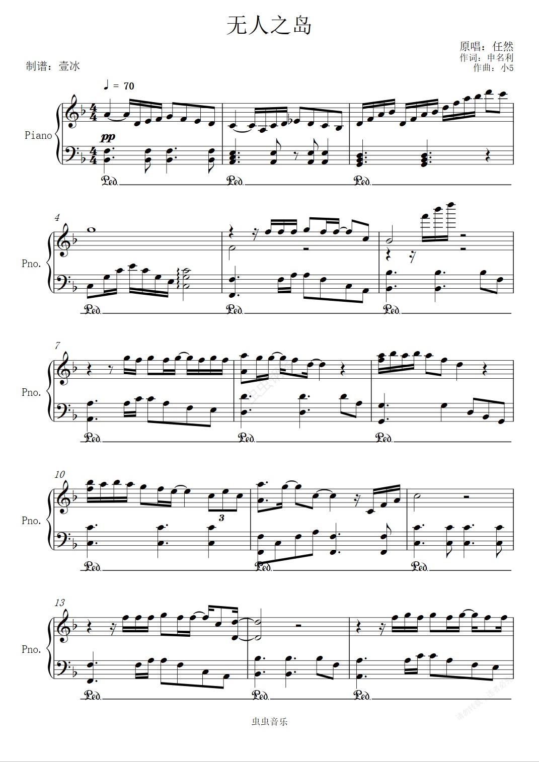 钢琴谱:无人之岛//任然-壹冰钢琴版