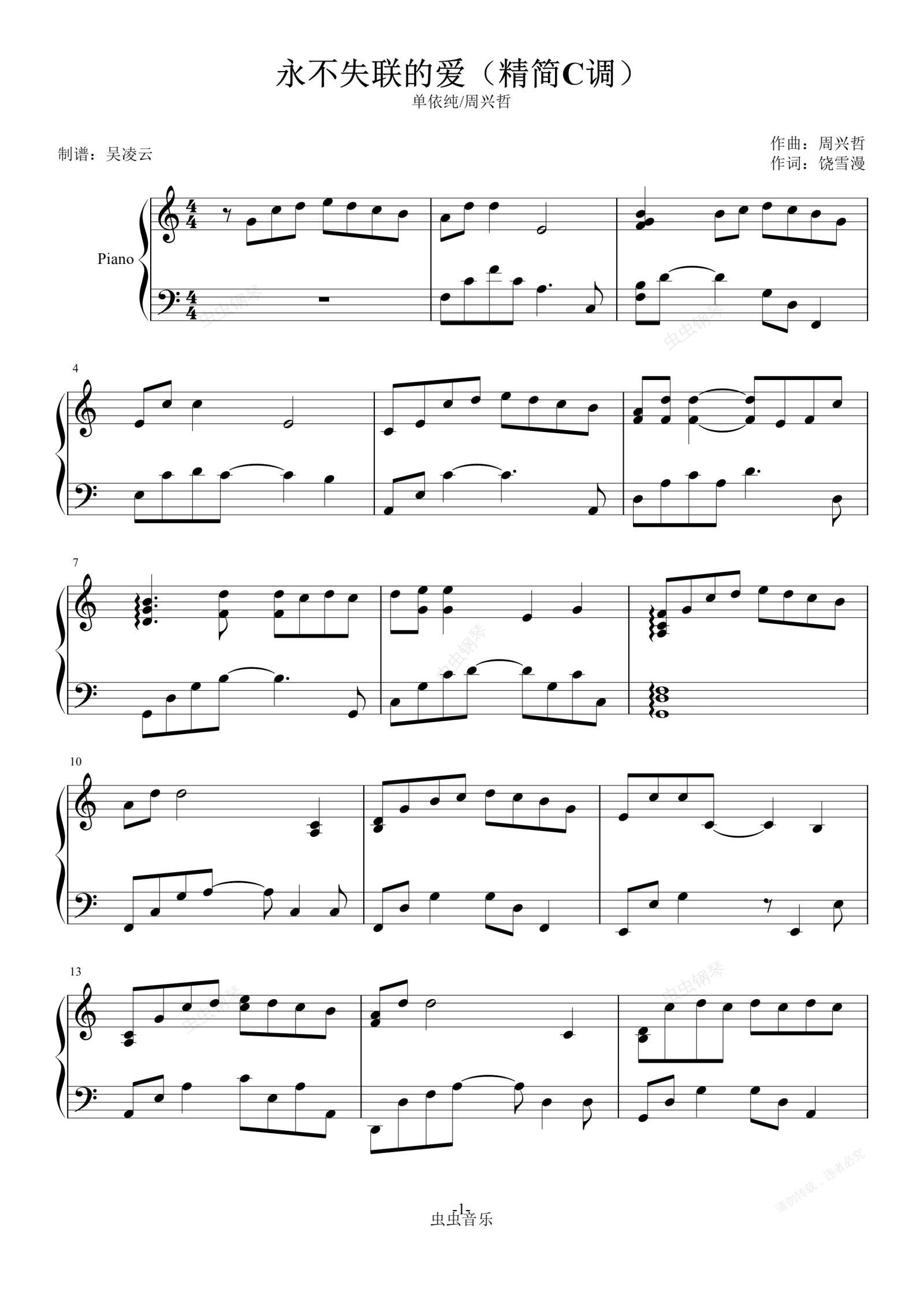 钢琴谱:永不失联的爱 周兴哲/单依纯 C调精简版钢琴实用版 吴凌云制