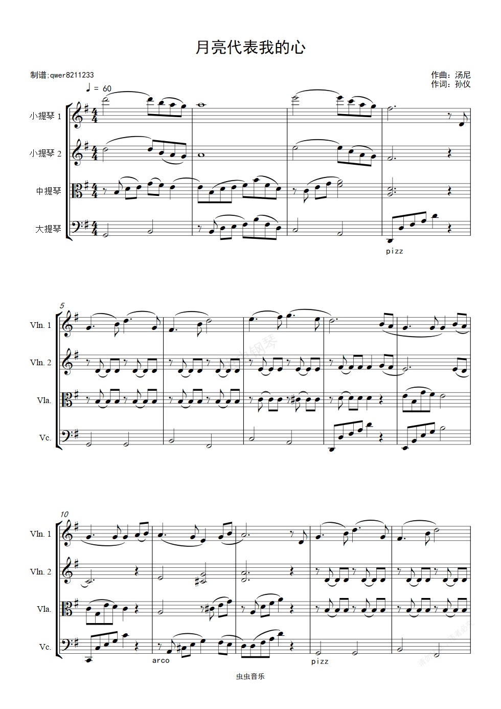 钢琴谱:月亮代表我的心(弦乐四重奏)