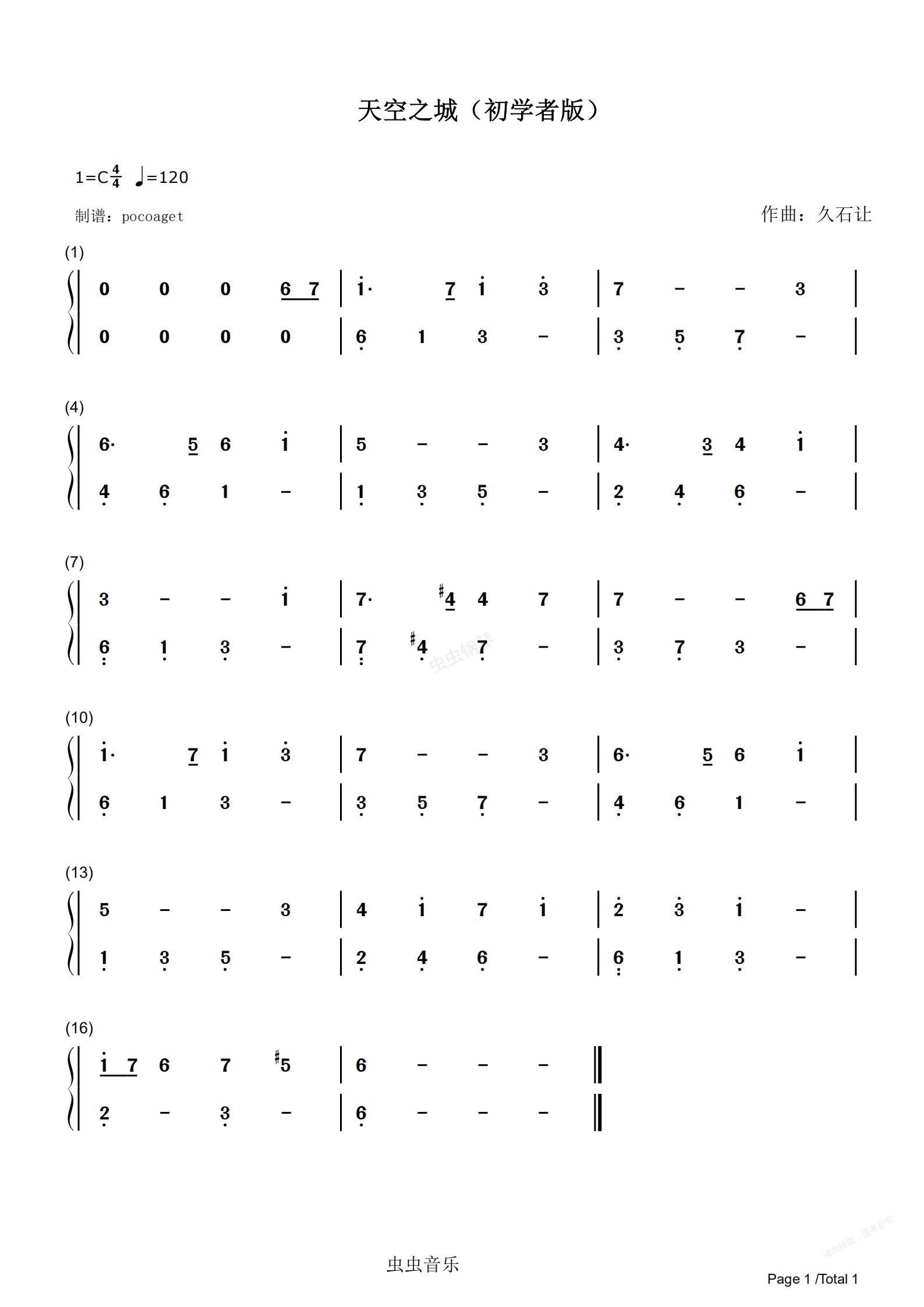 钢琴谱:《天空之城》简谱。超简单优美版(poc编配)