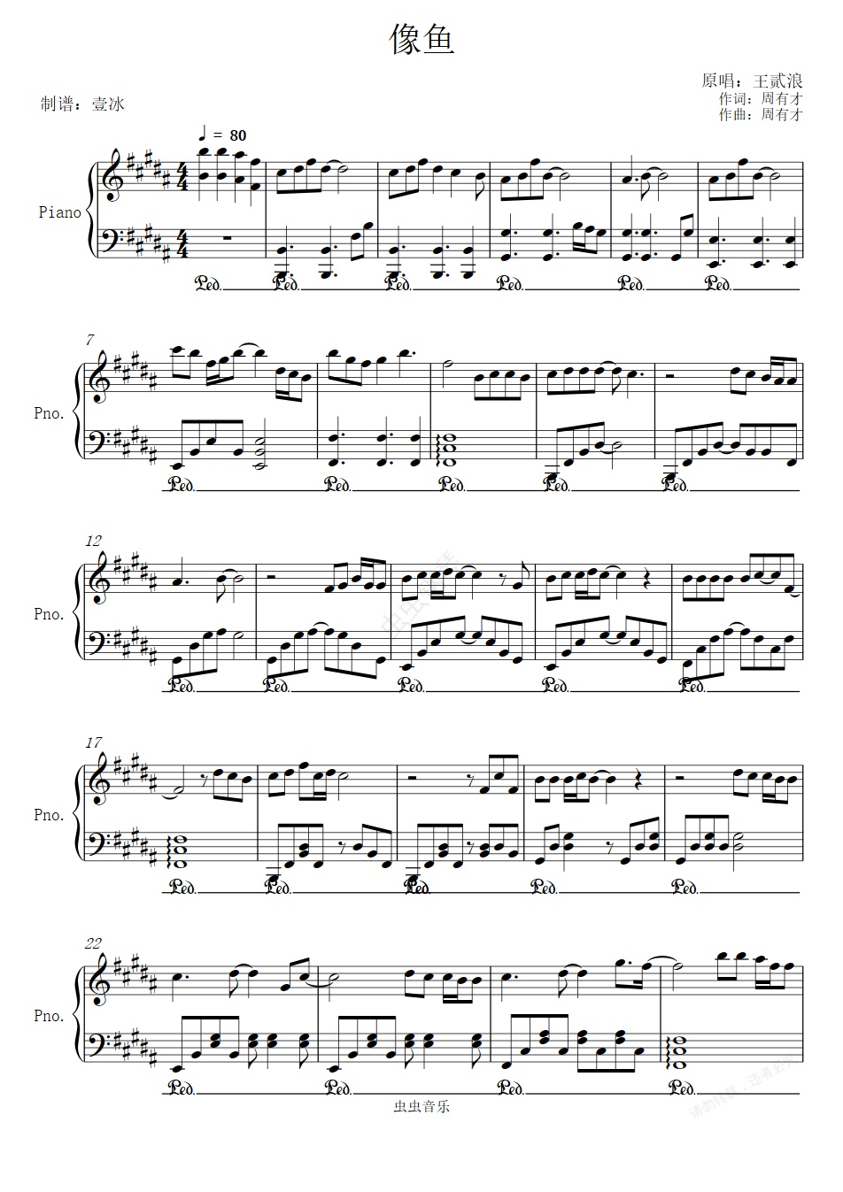 钢琴谱:像鱼//王贰浪-壹冰钢琴版