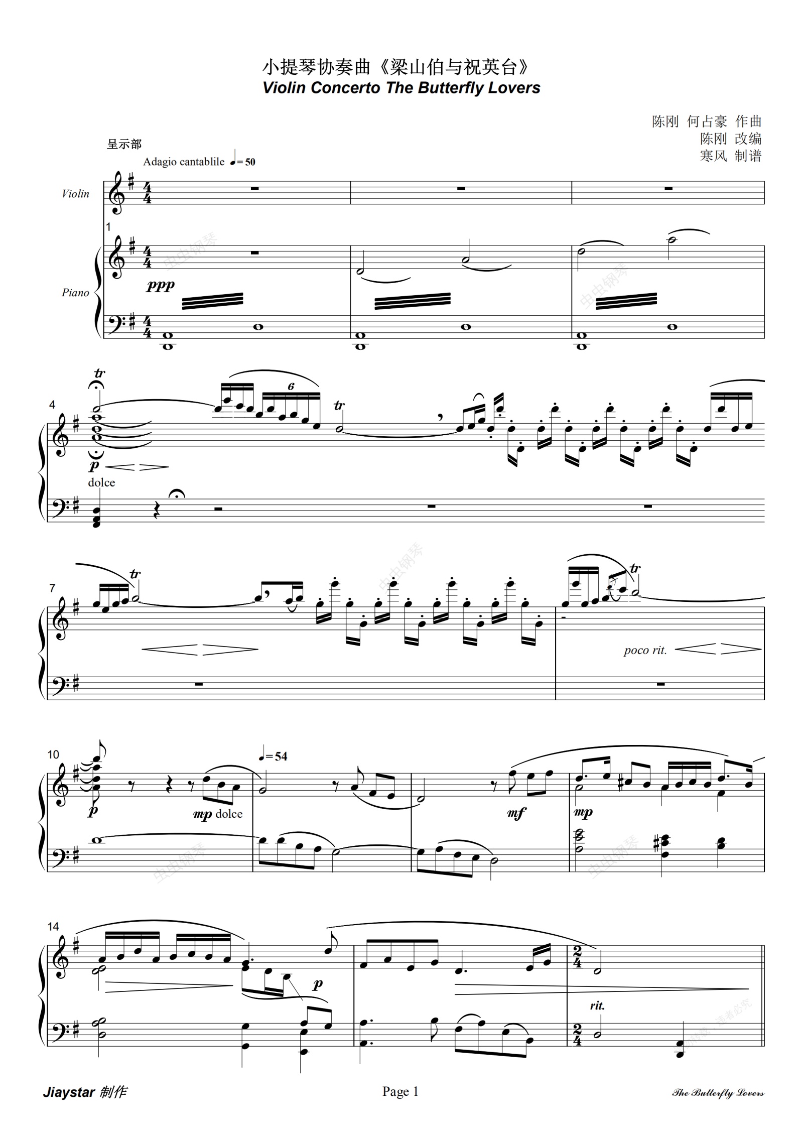 钢琴谱:梁祝(梁山伯与祝英台)- 小提琴/钢琴