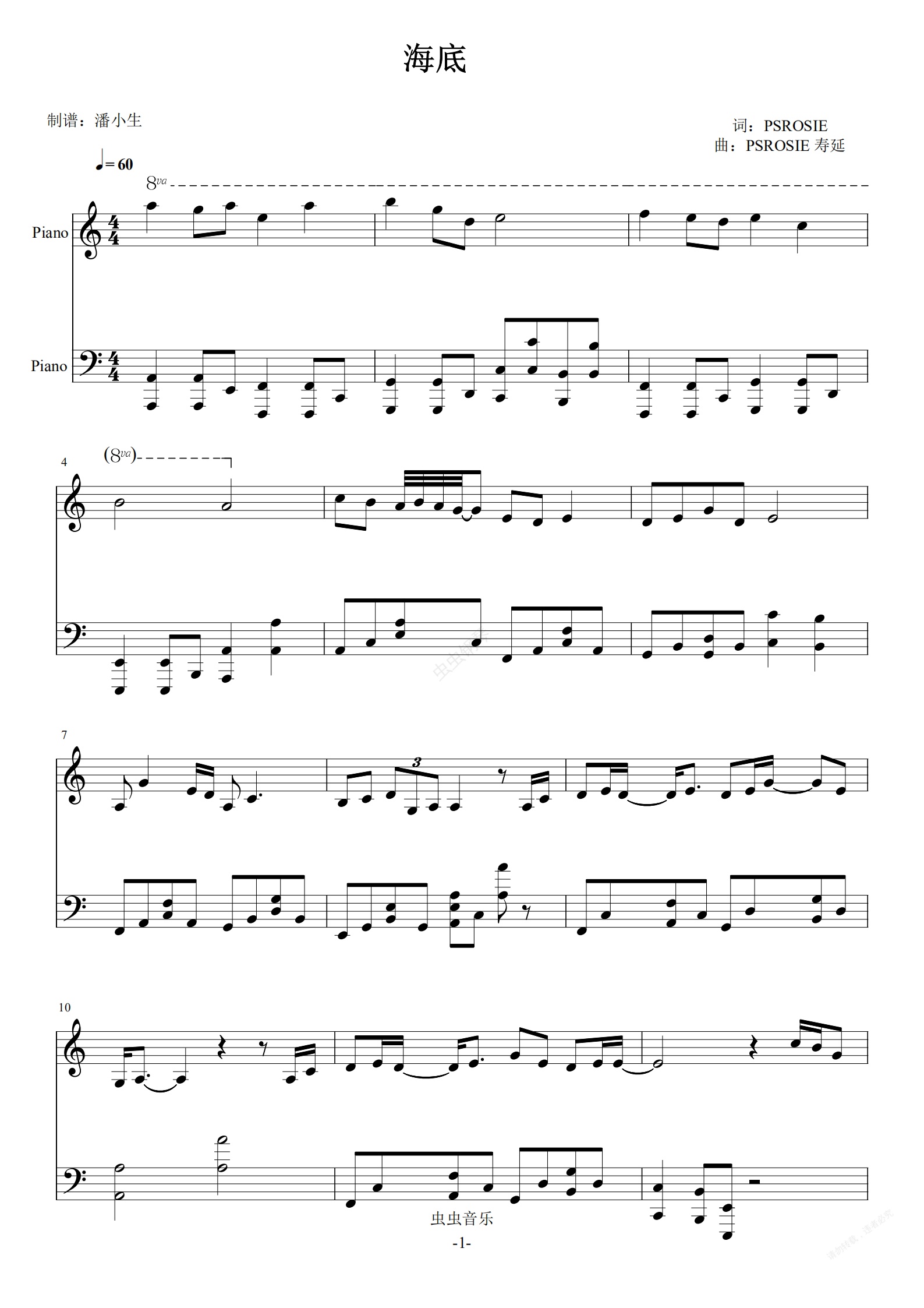 钢琴谱:海底 C调 深情 完美版 独奏版 一支榴莲